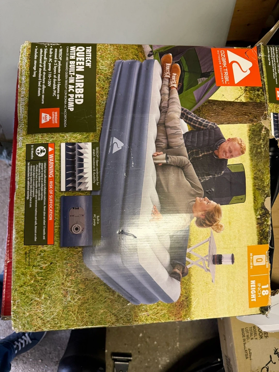 10Selling an Ozark Trail Tritech queen-sized airbed! It comes with a built-in AC pump that operates at 110-120V. The airbed features a Tritech polyester mesh I-beam construction encased in two layers of durable PVC, ensuring stretch resistance and durability. - Queen Size: 80 in x 60 in x 18 in - Includes a storage bag for easy portability