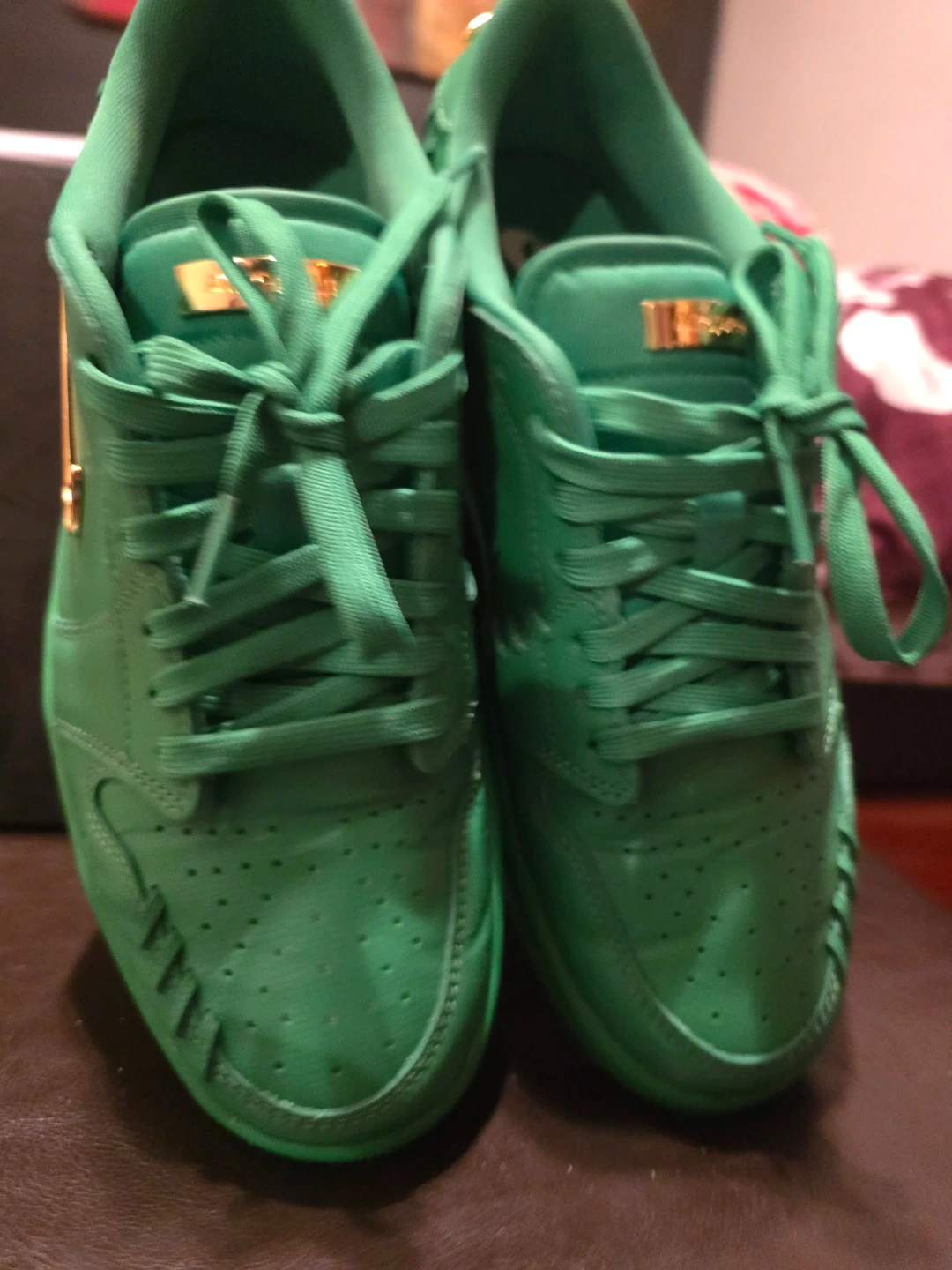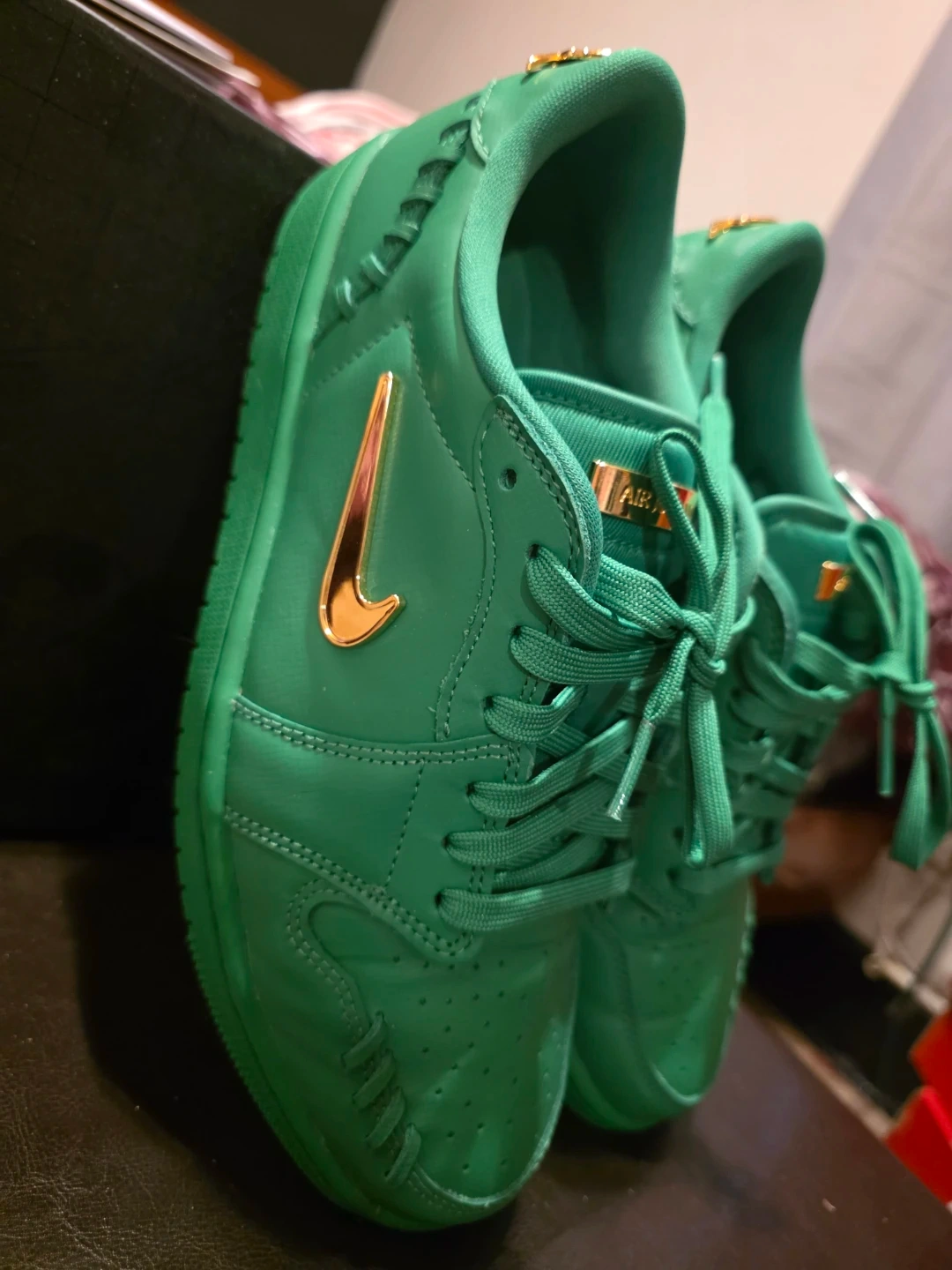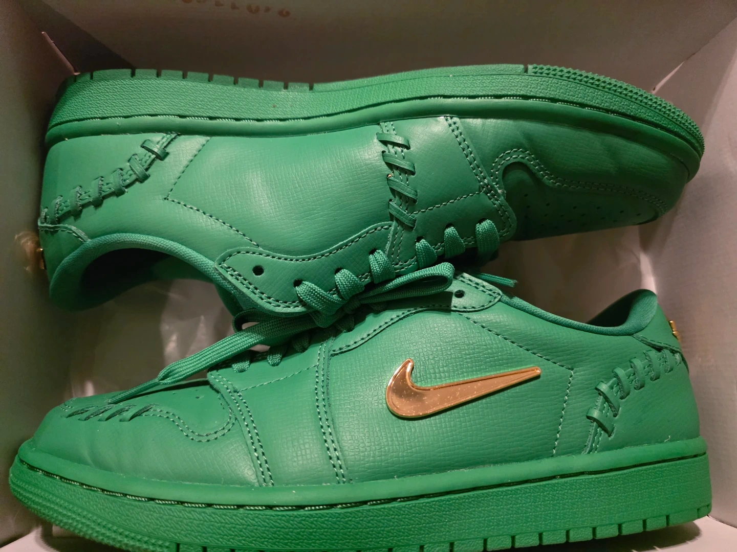 These are Nike Wmns Air Jordan 1 Low sneakers in a lucky green and metallic gold colorway. The shoes are a size 9 US. Includes original box. New cash only