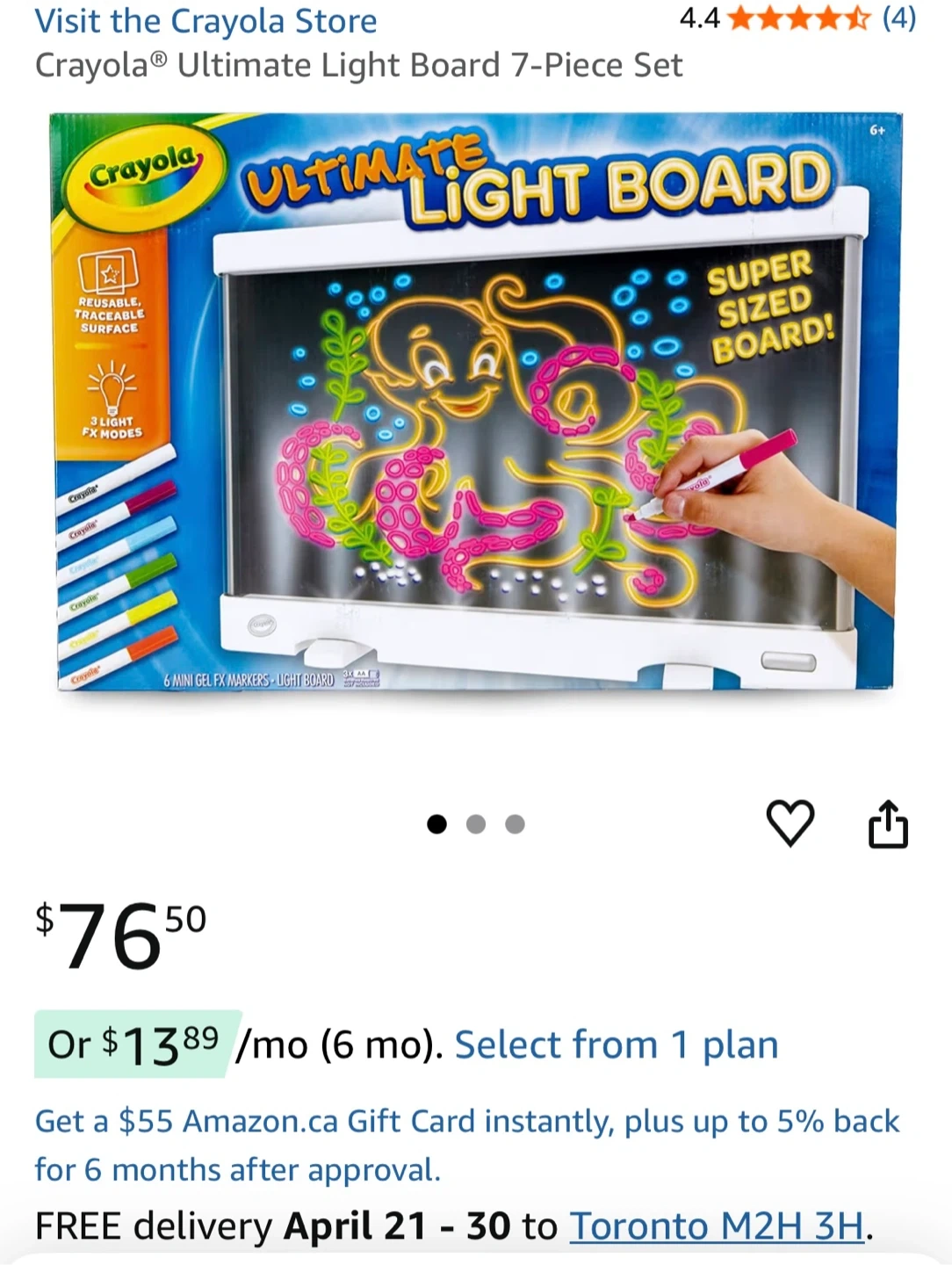 Selling a Crayola Ultimate Light Board! It's in new condition and comes with the original box. This super-sized board is perfect for reusable tracing and has a surface à tracer. It also features three light modes. Comes with 6 mini gel FX markers!