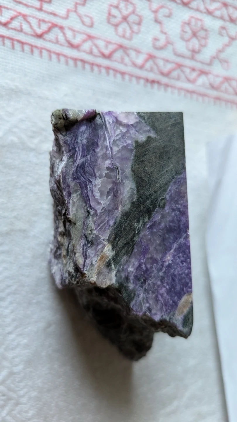 This is a raw chunk of Charoite. It's known for its swirling purple patterns and unique crystalline structure. It's a beautiful piece for any mineral collector! Approximately 2" by 4".