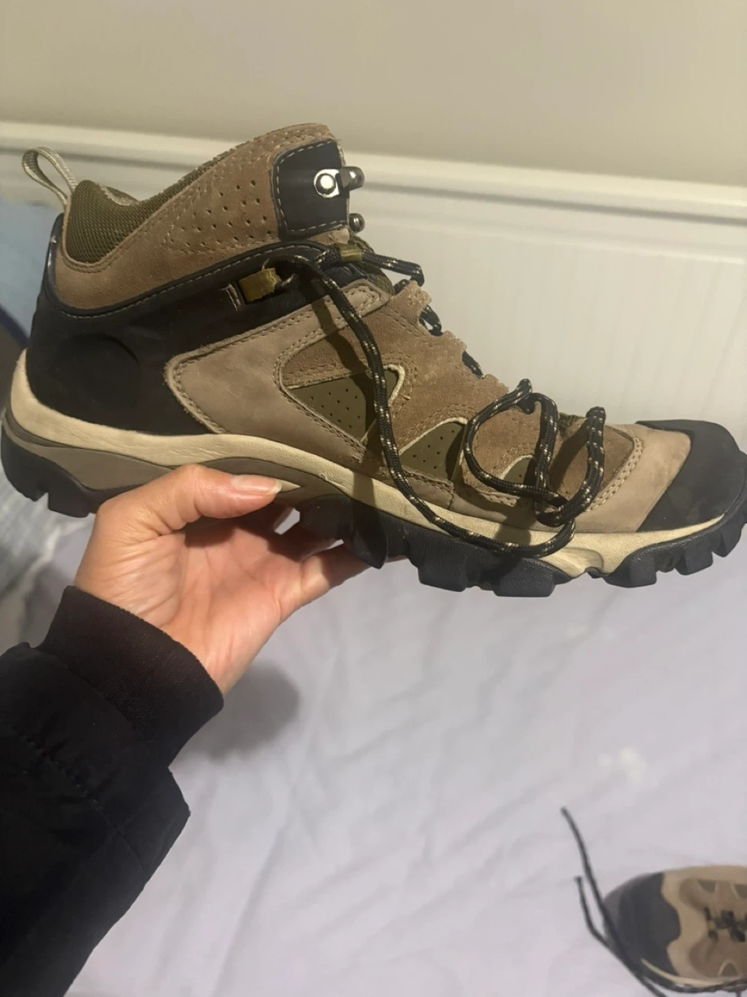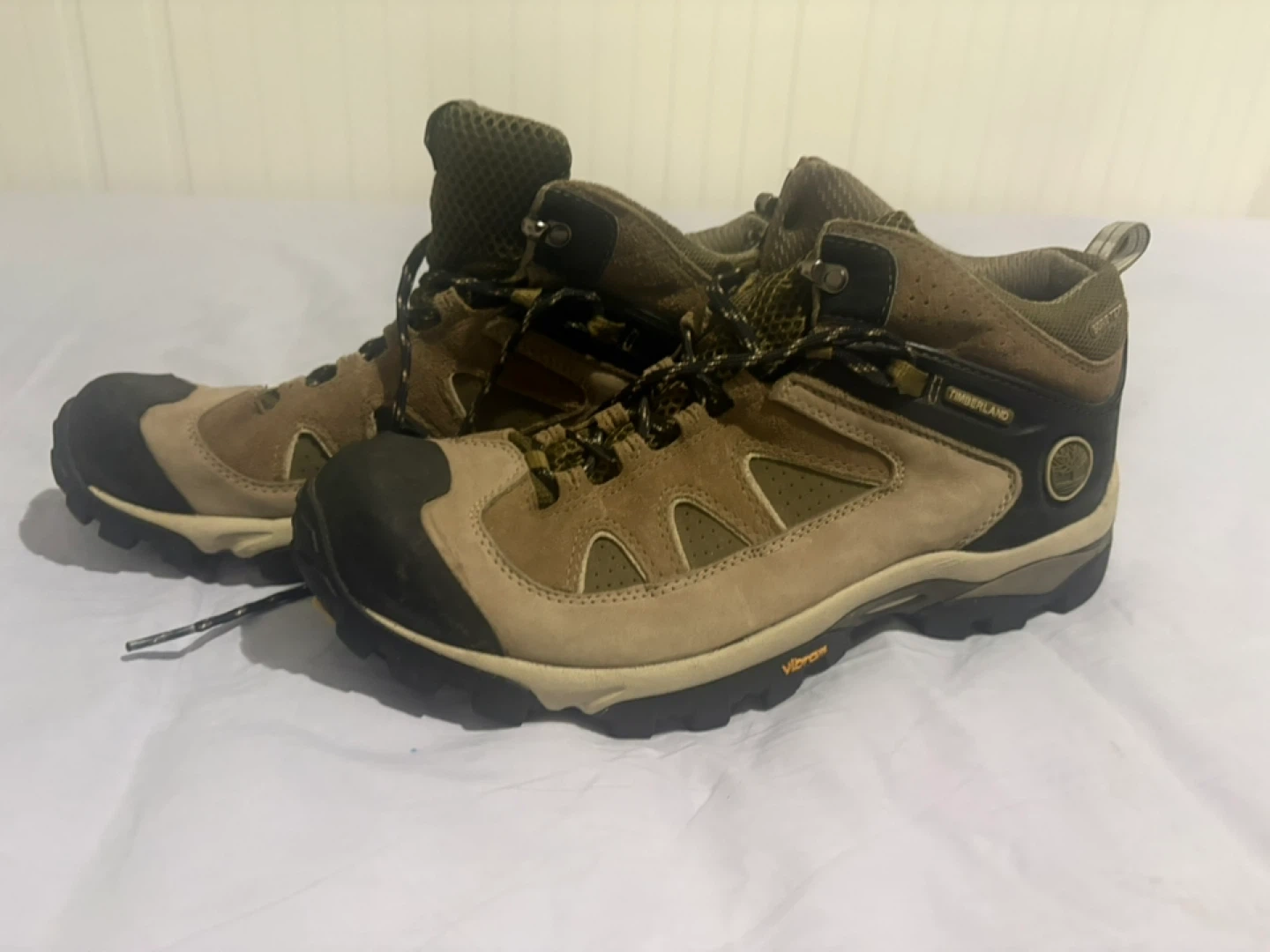 Selling a pair of Timberland hiking boots in size 9.5. They feature a Vibram sole for great traction. They're in good condition and ready for your next outdoor adventure!