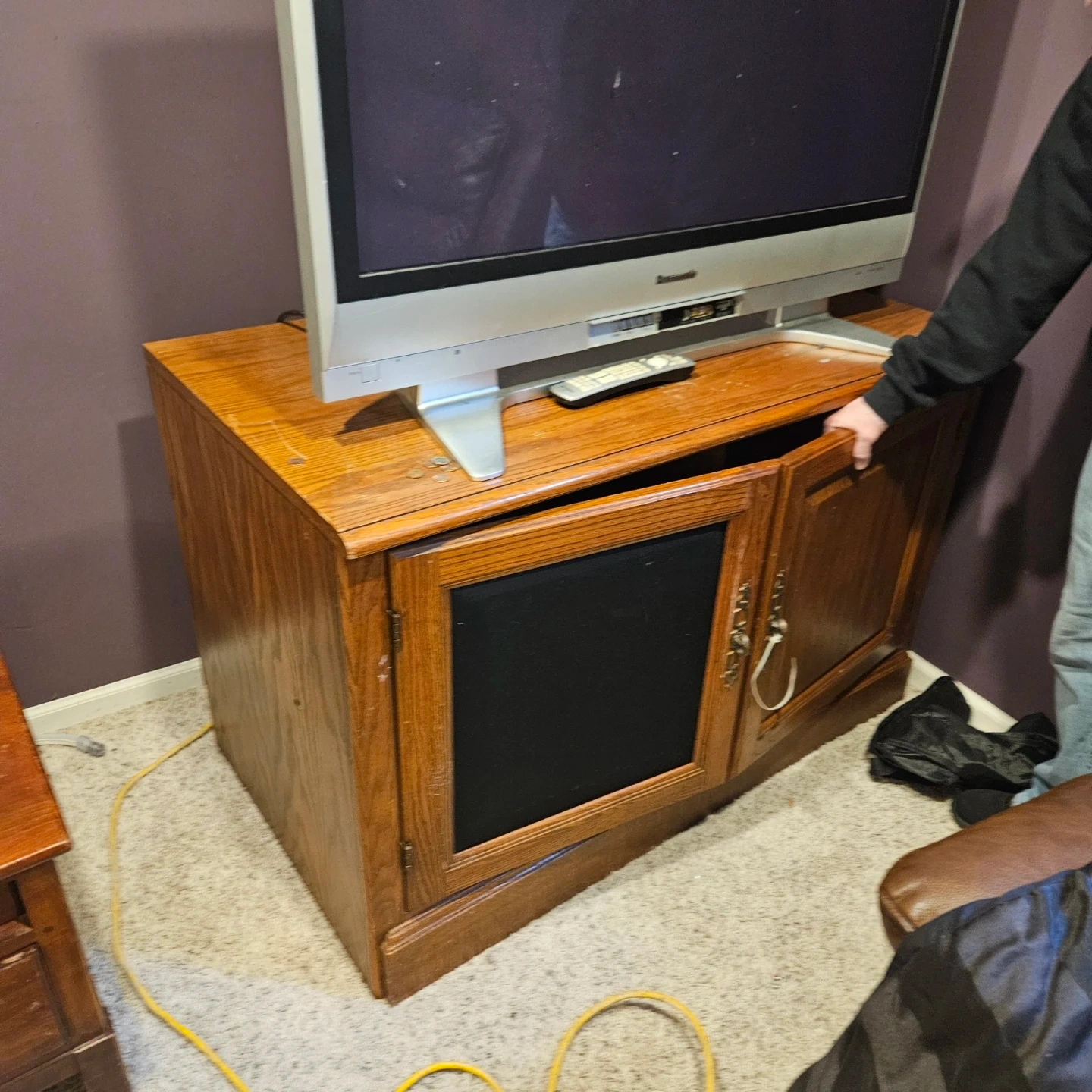 A classic wooden media console cabinet with a black fabric insert on the door or solid wood It offers storage space for media components. This cabinet is made of wood.