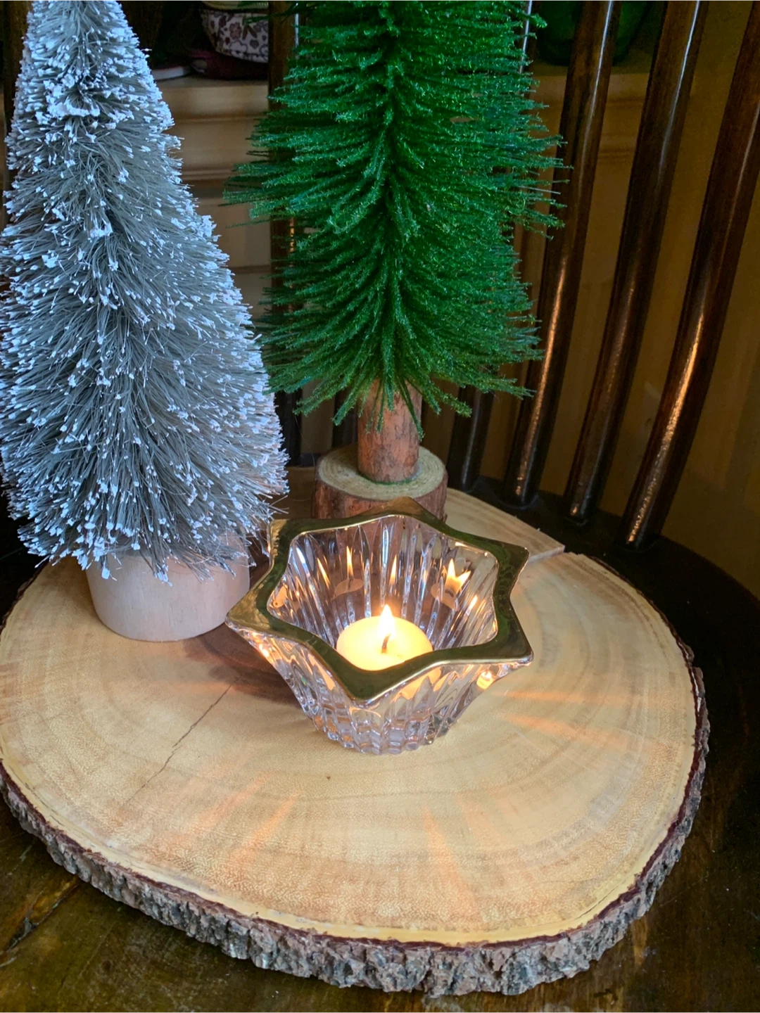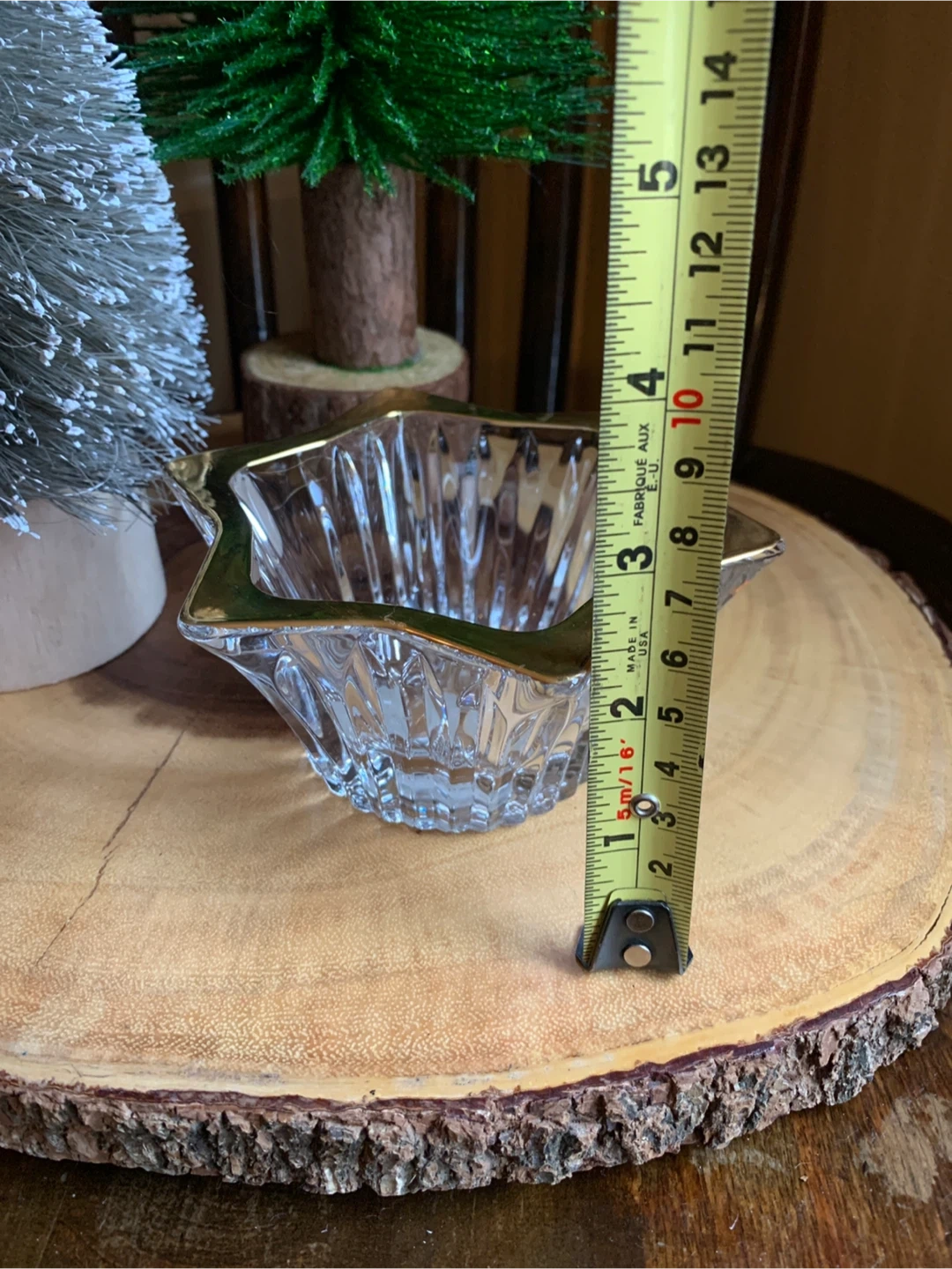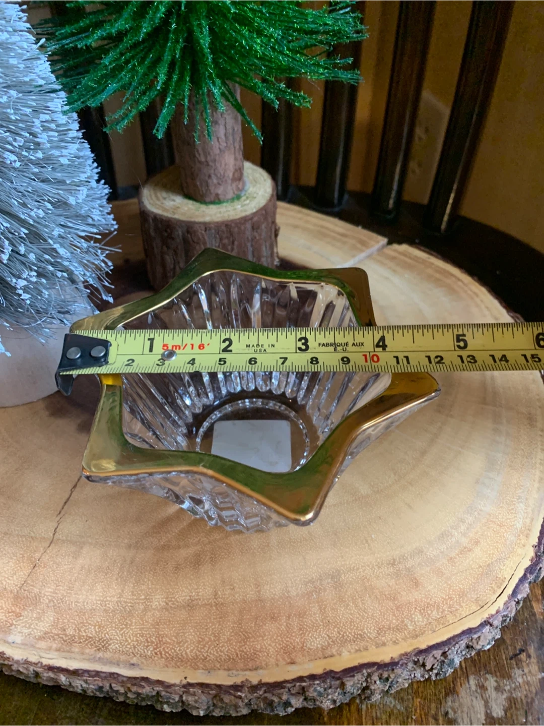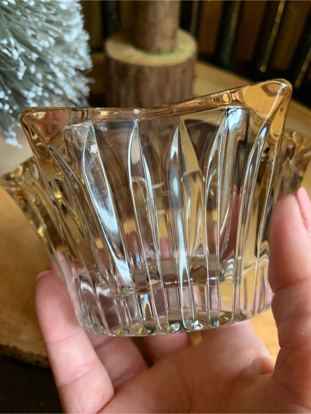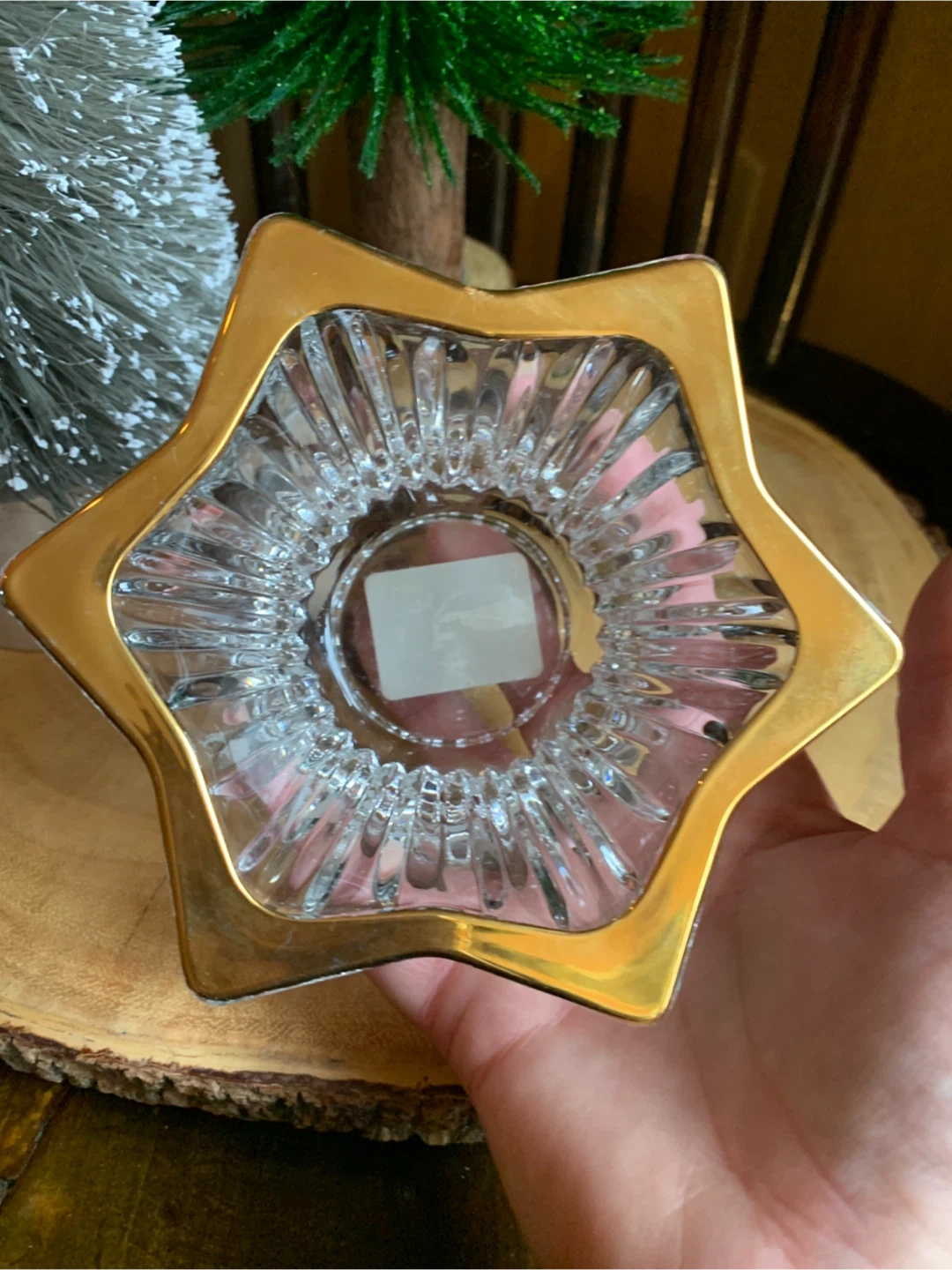 A star-shaped votive candle holder made from clear, textured glass with a gold-toned rim. The glass has vertical ridges, which likely help diffuse the light from a candle placed inside, creating a warm and glowing effect. No chips or cracks. The gold rim adds a touch of elegance and sophistication. A really nice piece!