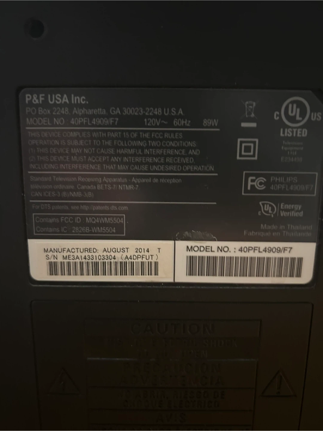 Selling a Philips 40-inch TV, model number 40PFL4909/F7. It's in good working condition. Manufactured in August 2014.