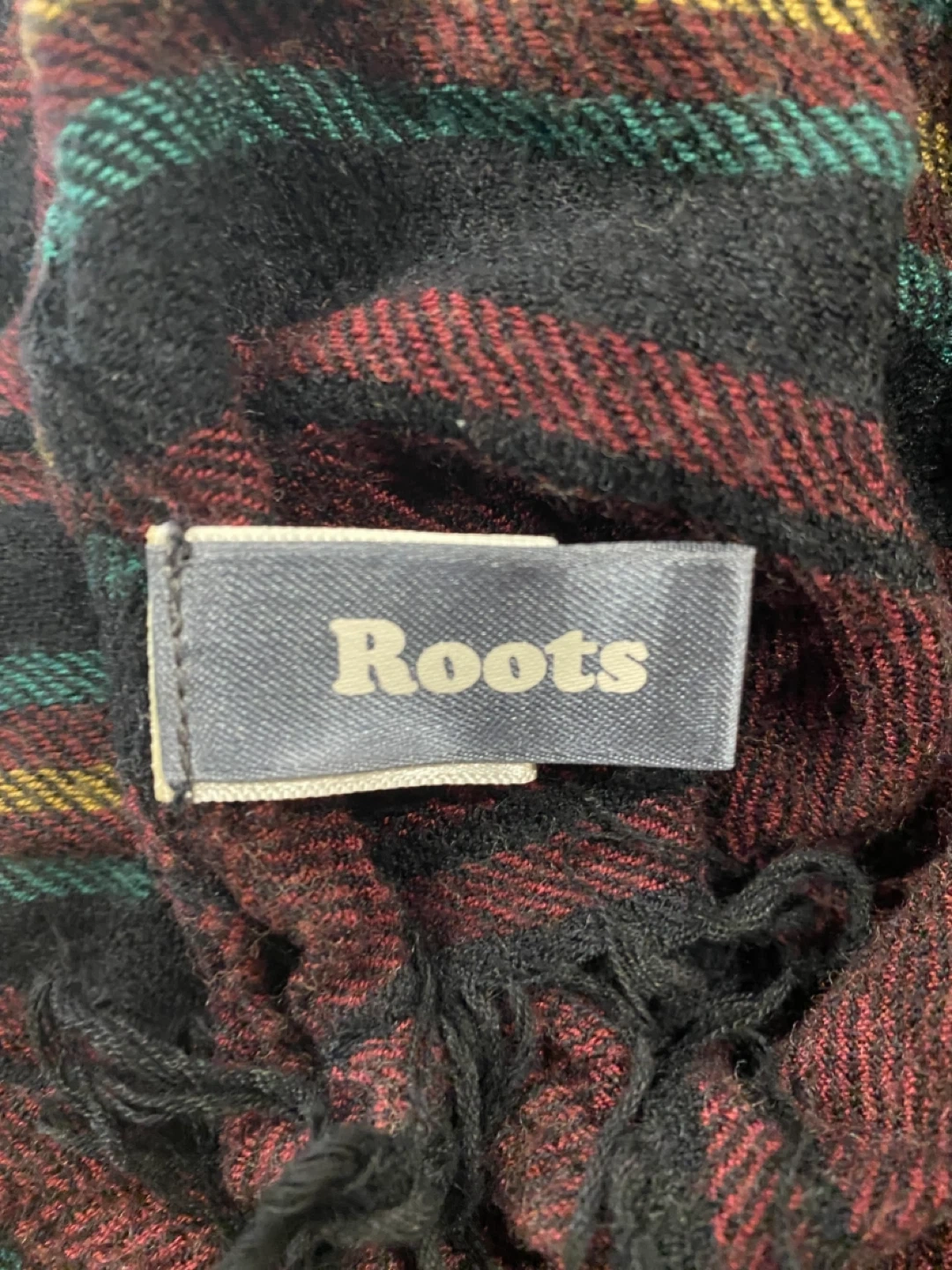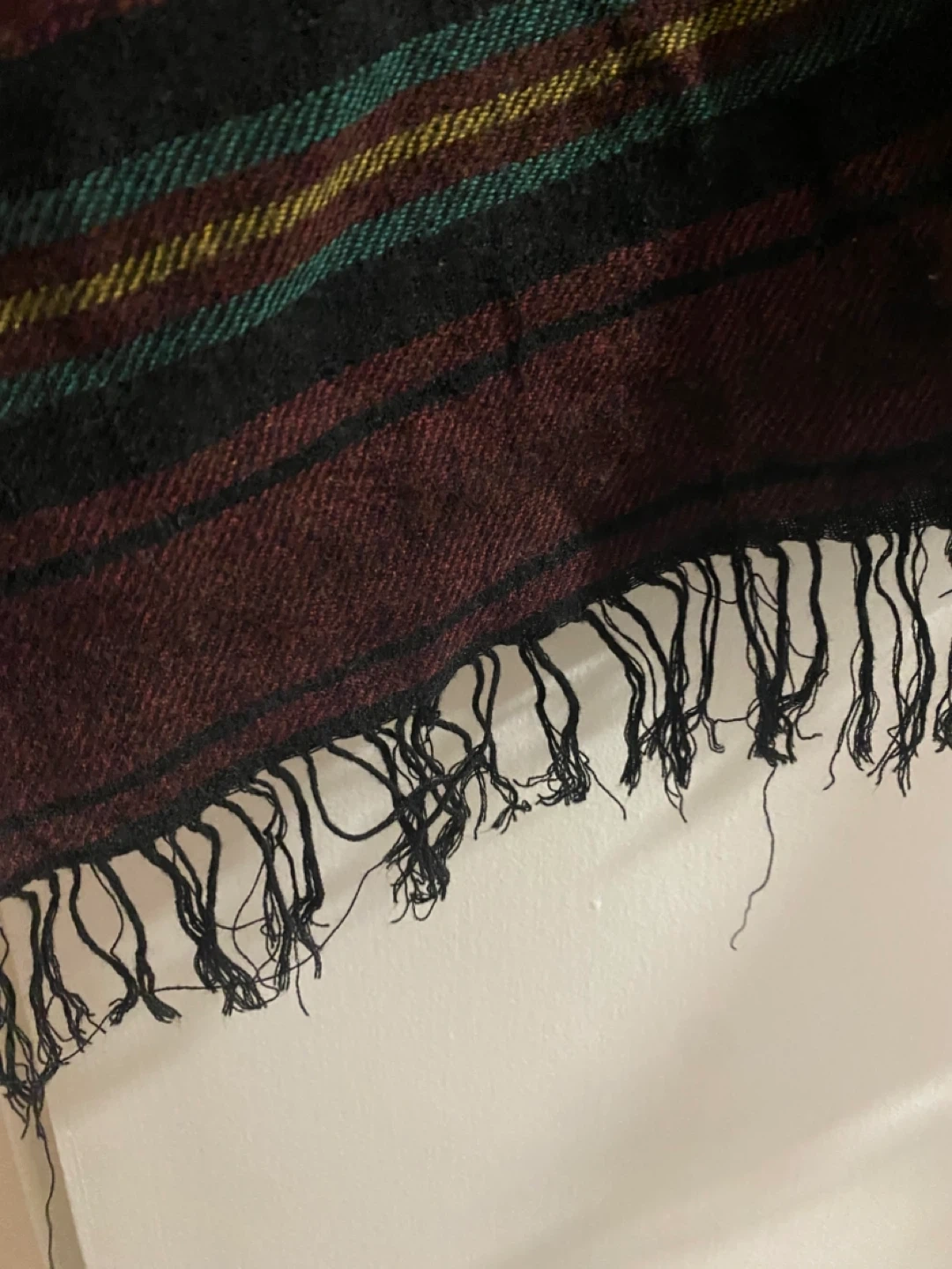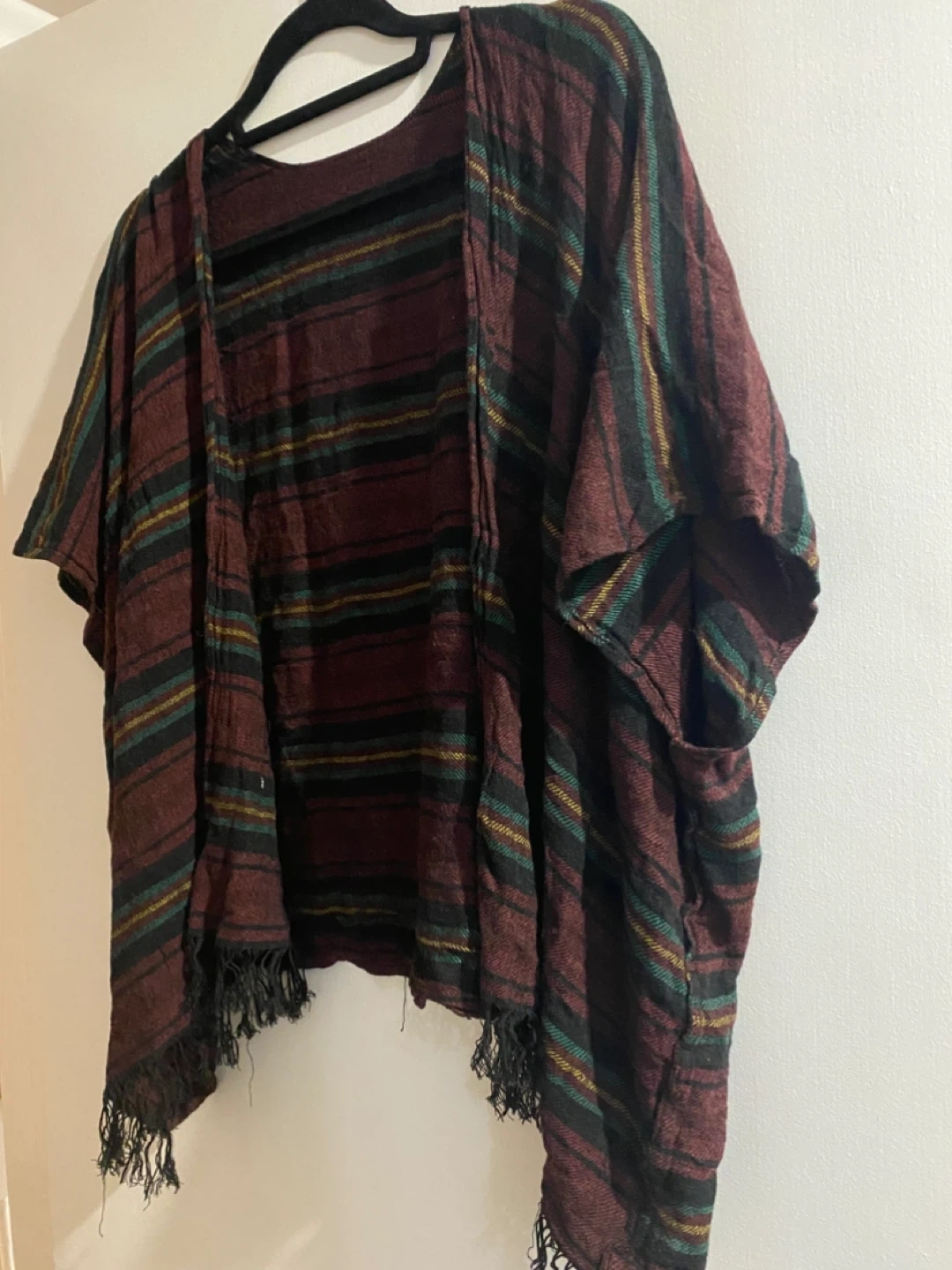 Selling a ROOTS kimono made of A viscose and wool mix. It features a striped pattern in burgundy, black, teal, and yellow. Perfect as a light layer! It is labeled as one size.