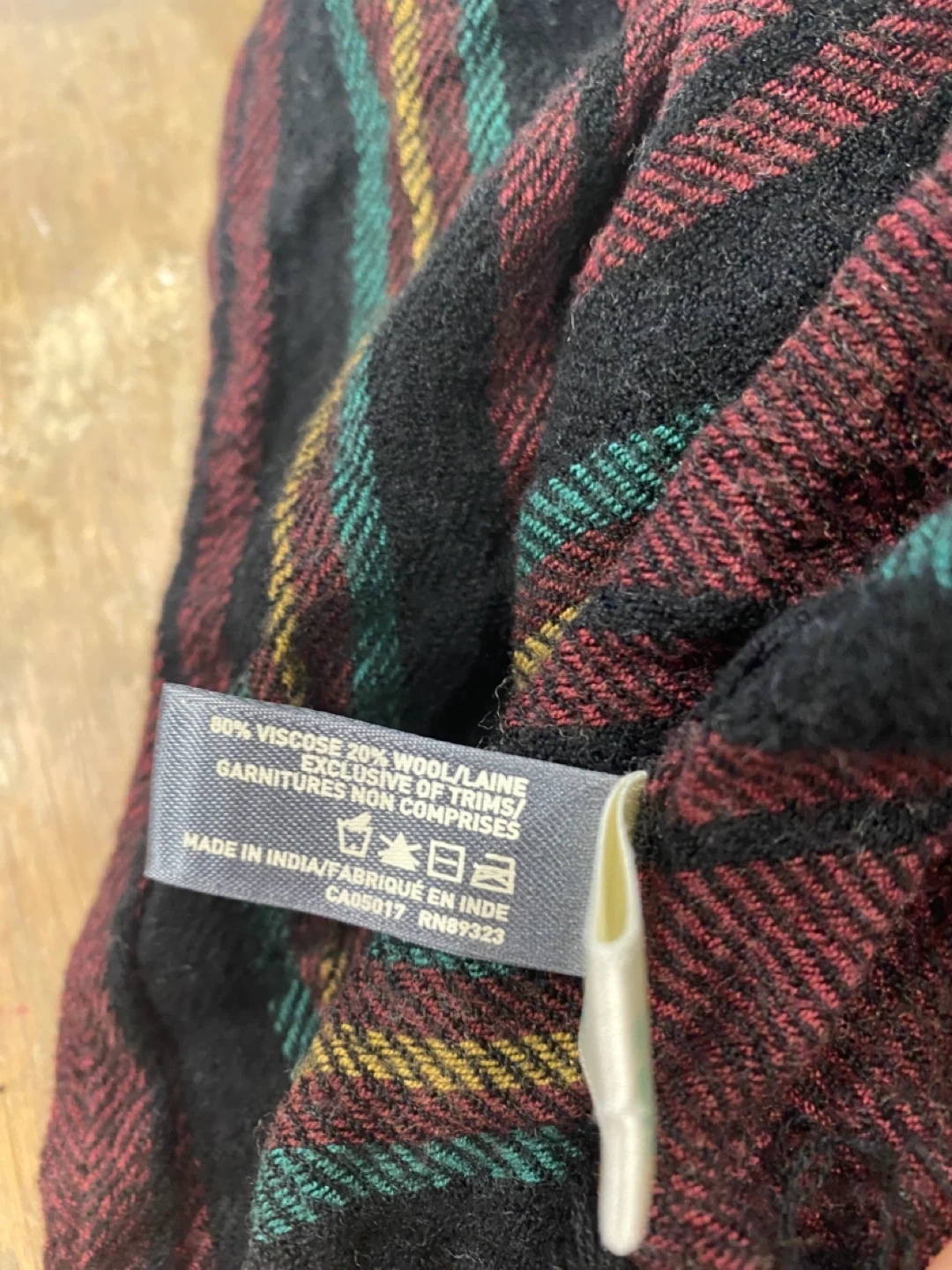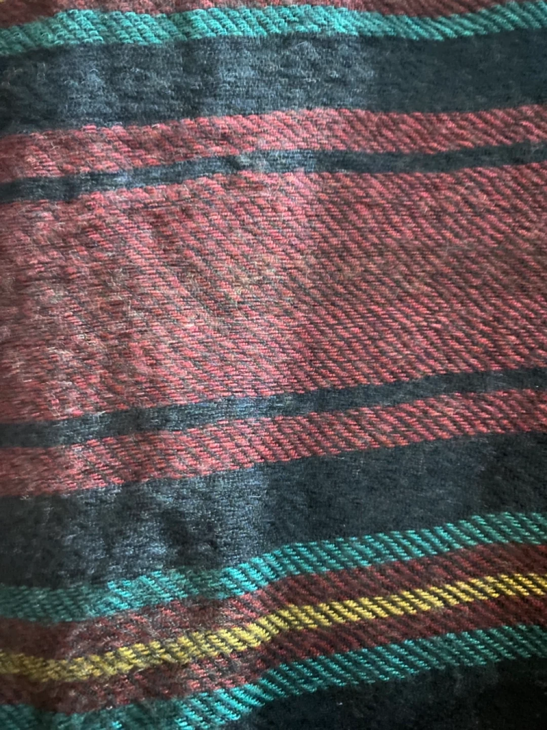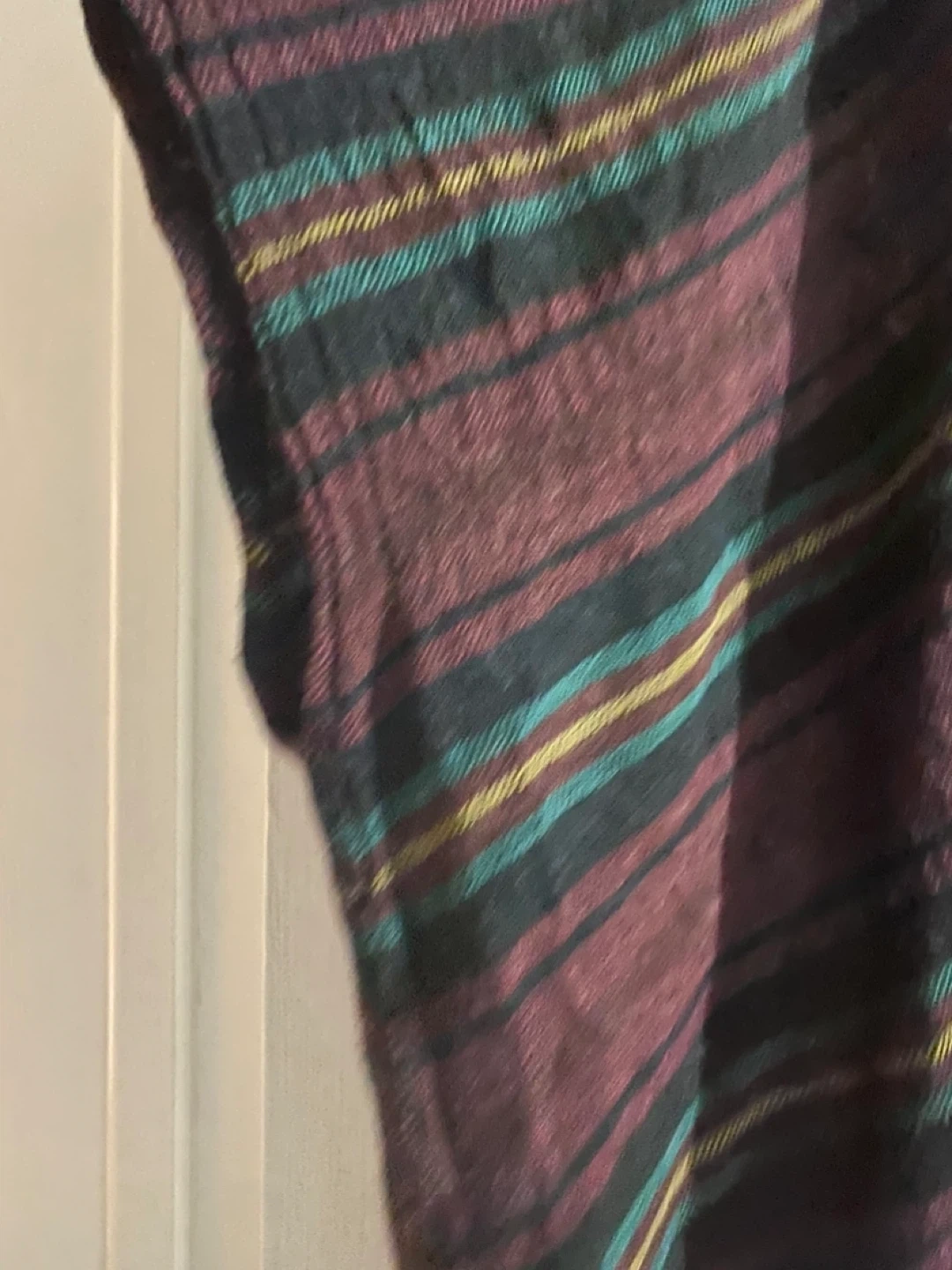 Selling a ROOTS kimono made of A viscose and wool mix. It features a striped pattern in burgundy, black, teal, and yellow. Perfect as a light layer! It is labeled as one size.