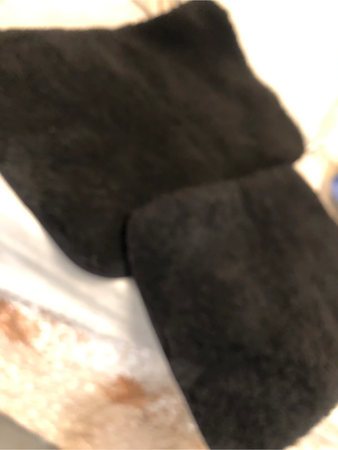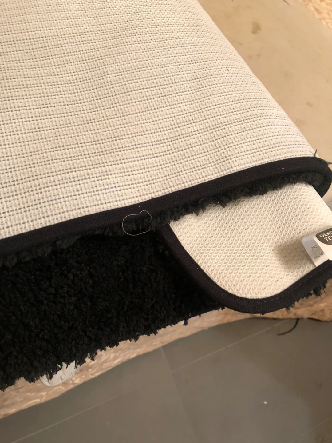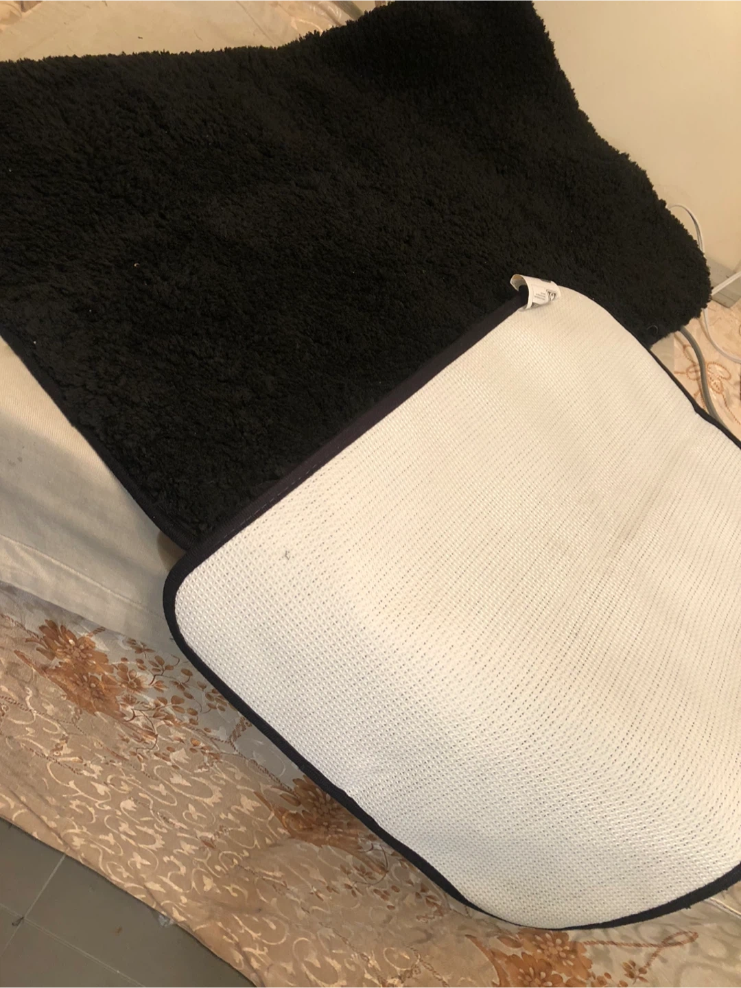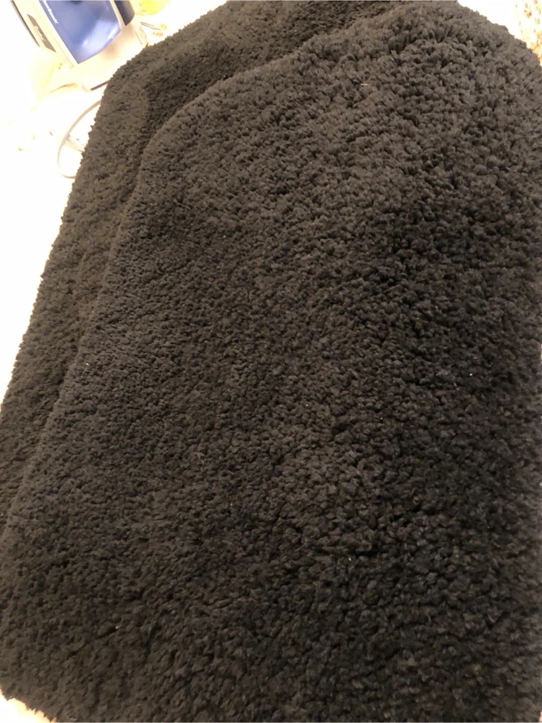 Soft, fluffy black shag bath mat. It's a good size for most bathrooms. The backing has a non-slip texture. This mat is great for absorbing water after a shower!