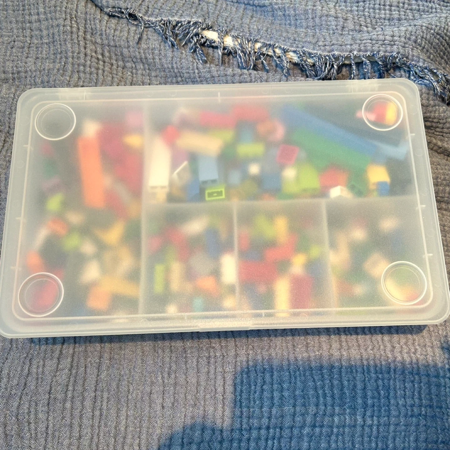 A collection of colourful Lego building bricks is organized in a clear, multi-compartment storage box. The bricks include various shapes and sizes for creative building projects. This set is great for inspiring young builders and for keeping pieces tidy. Bin sold separately for $6, stacks nicely.