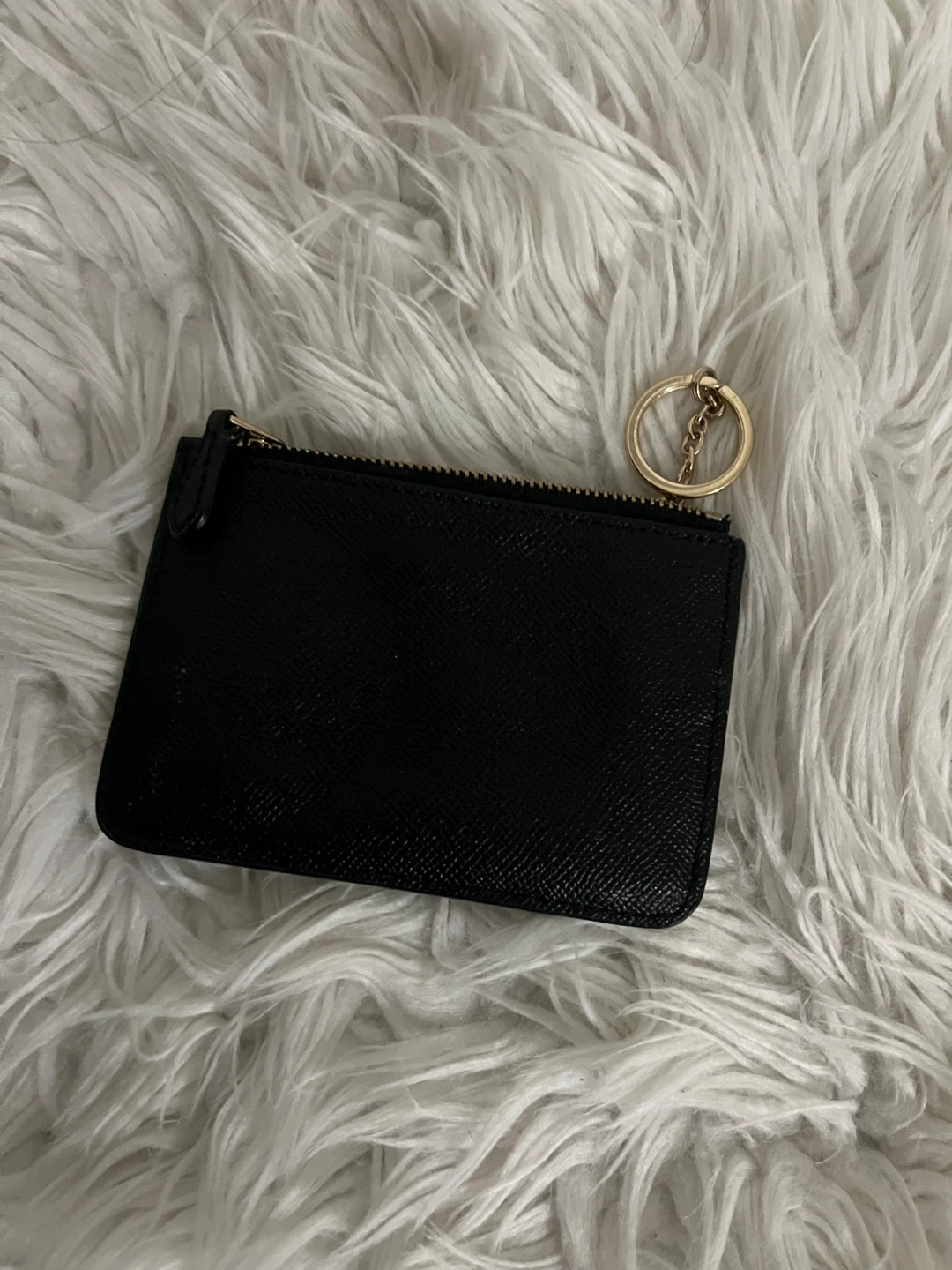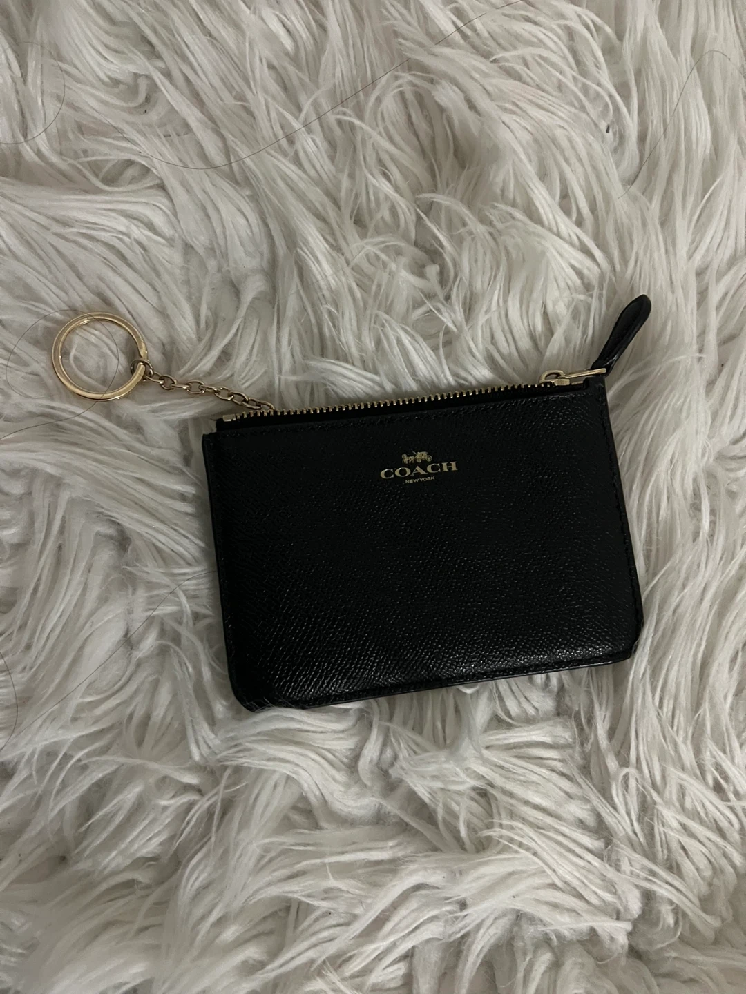 This is a black leather coin pouch from Coach. It's made of pebbled leather and has a zippered closure. A gold-toned keychain is attached. Perfect for carrying cards or change!