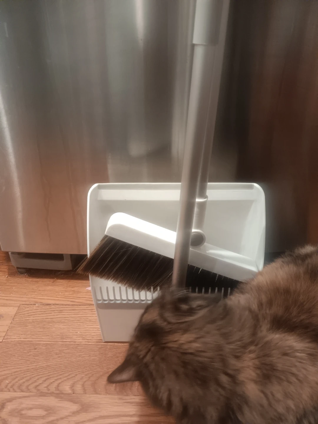 This white dustpan and brush set makes cleaning up easy. It includes a dustpan and a brush with bristles. The brush snaps onto the dustpan for convenient storage.