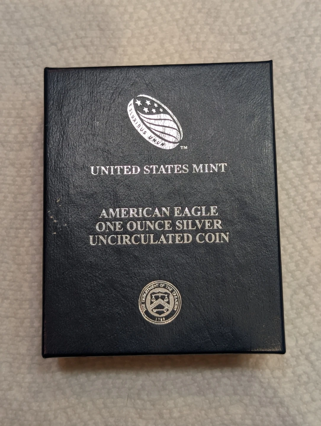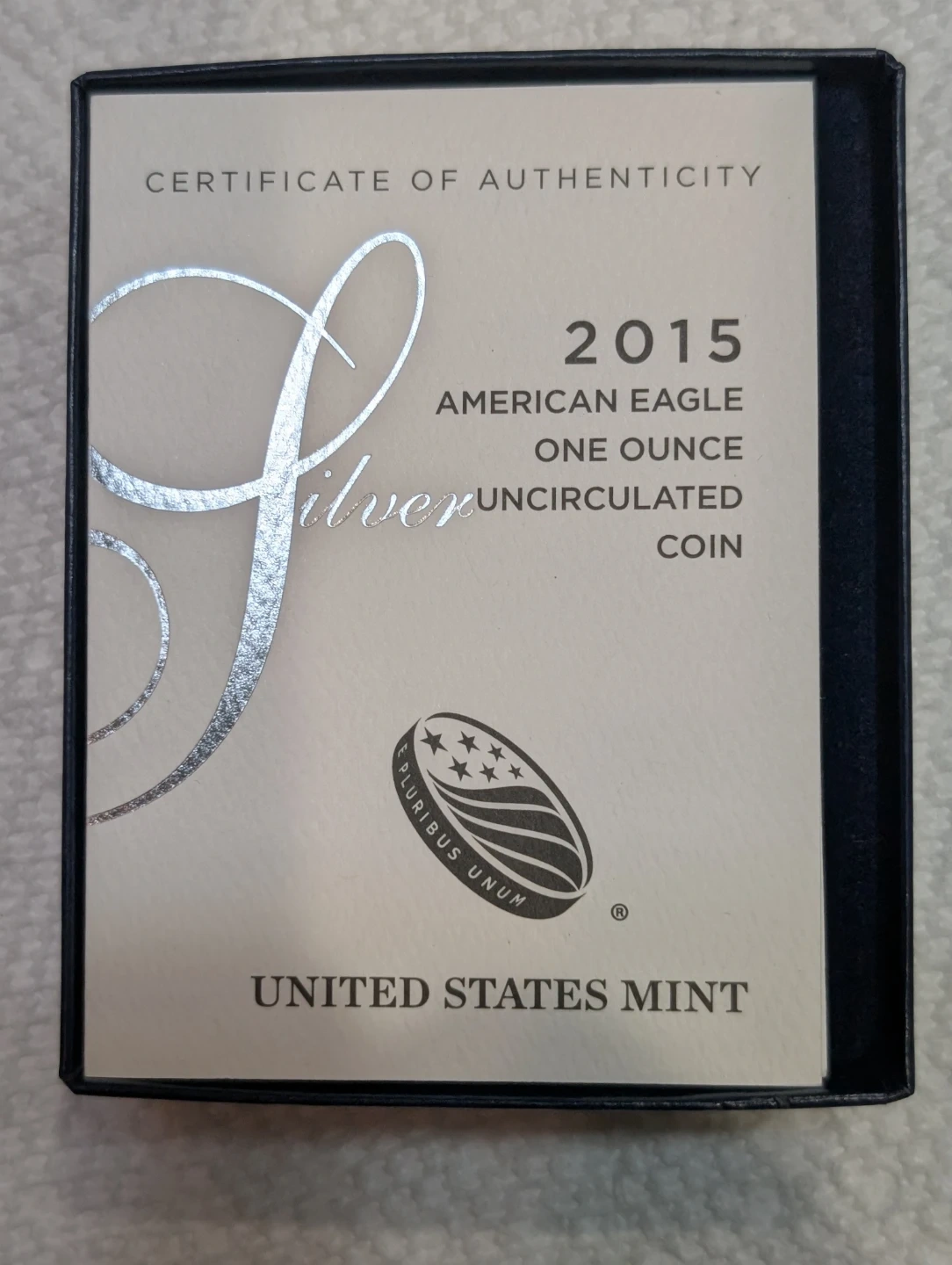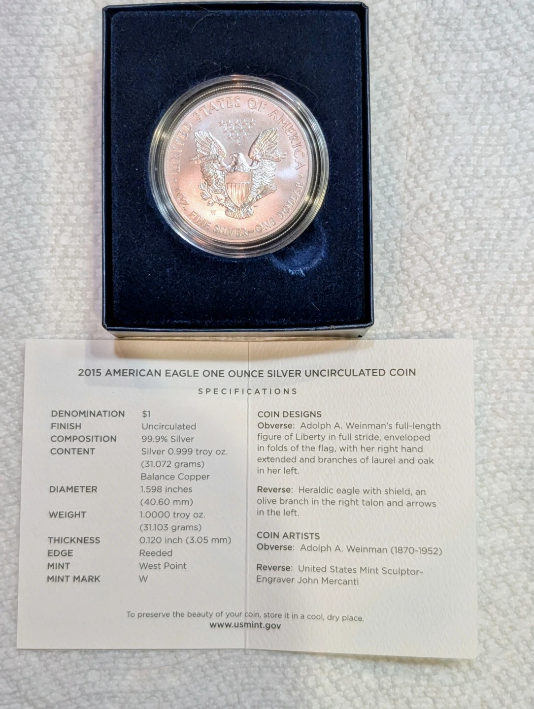 This is a 2015 American Eagle one ounce silver uncirculated coin from the United States Mint. It's made of 99.9% silver and has a diameter of 1.594 inches. The coin's thickness is 0.120 inch . Content Silver 0.999 Troy ounce ( 31.072 grams) mint West Point.