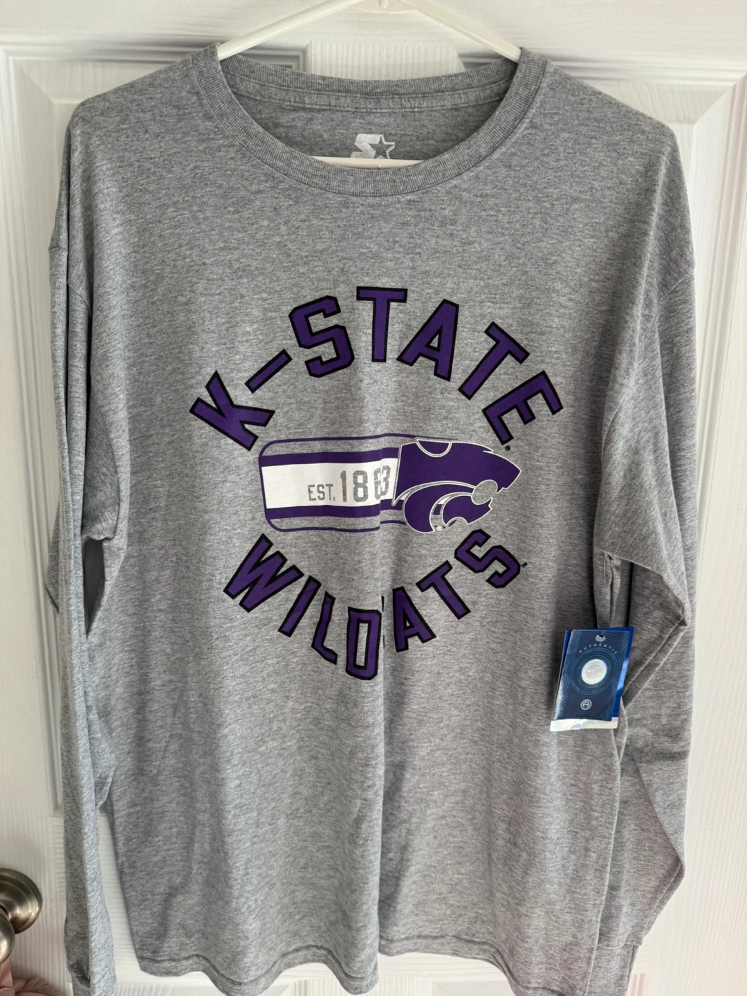 Selling a Starter K-State Wildcats long sleeve shirt in size L. The shirt is gray and made of 60% cotton and 40% polyester. Great for showing your team spirit!