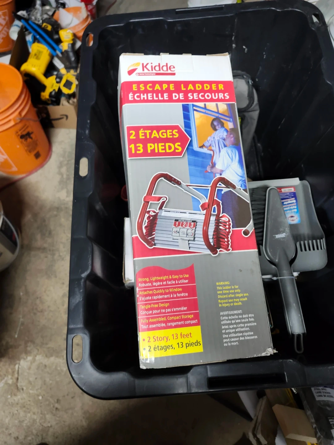 Kidde escape ladder designed for 2 stories and 13 feet. It's strong, lightweight, and easy to use, attaching quickly to windows. The ladder features a tangle-free design and compact storage.