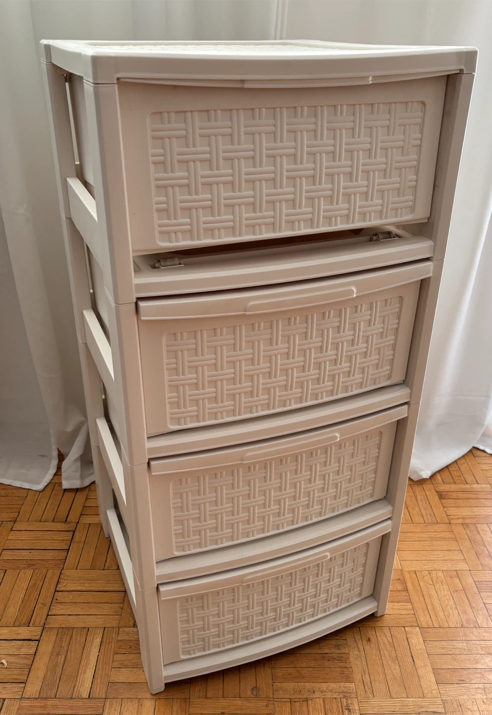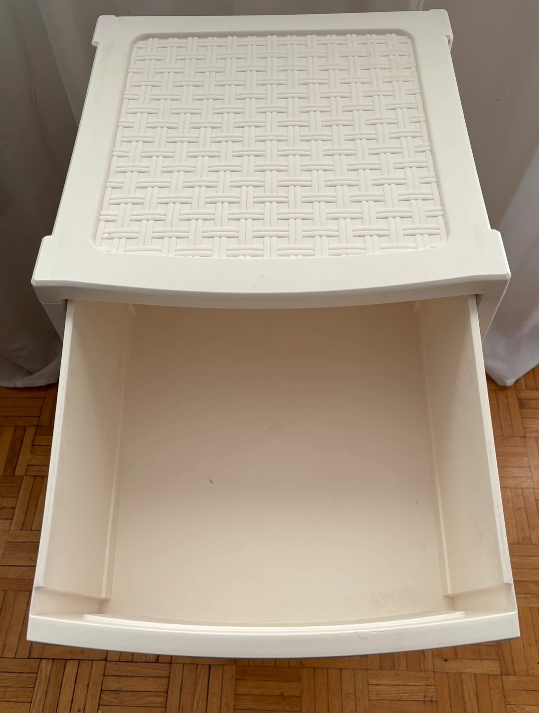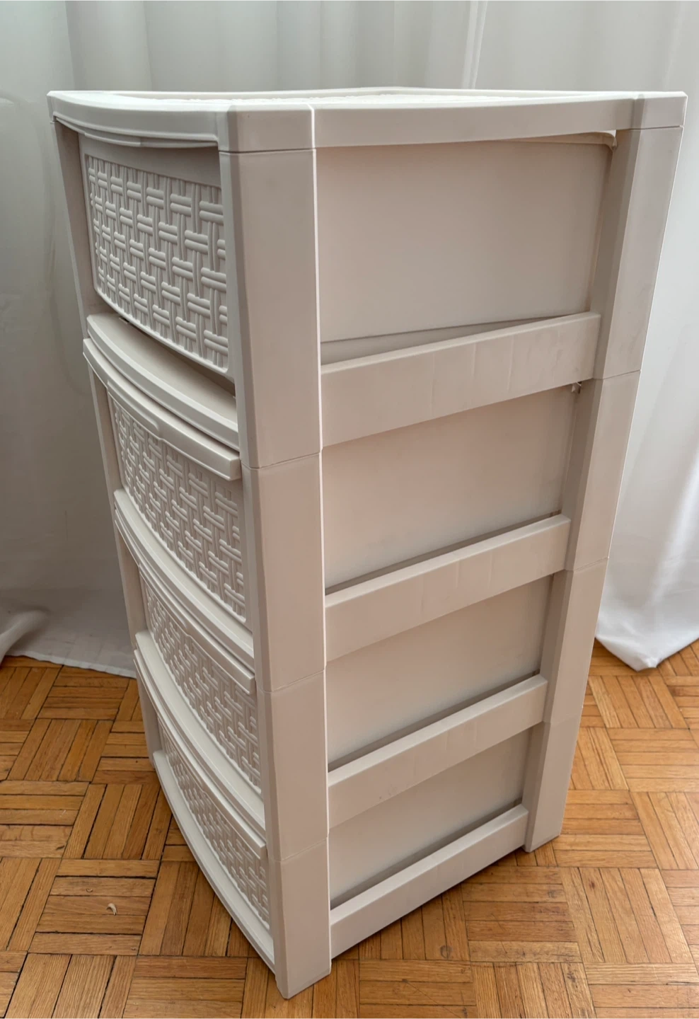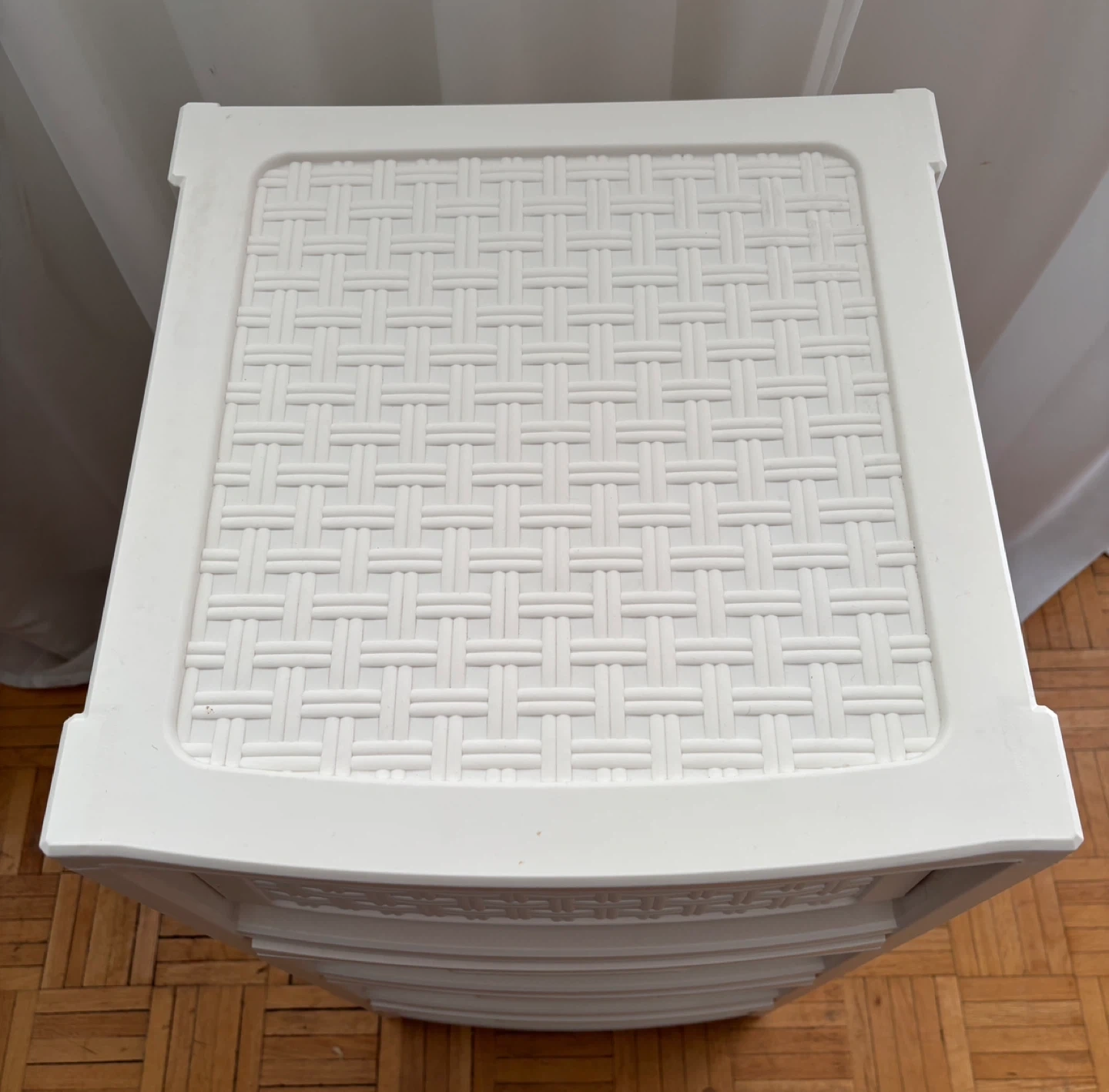 White plastic storage unit with five drawers. It has a woven pattern on the top and drawer fronts.