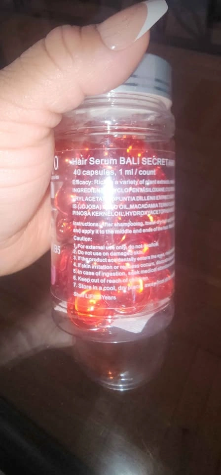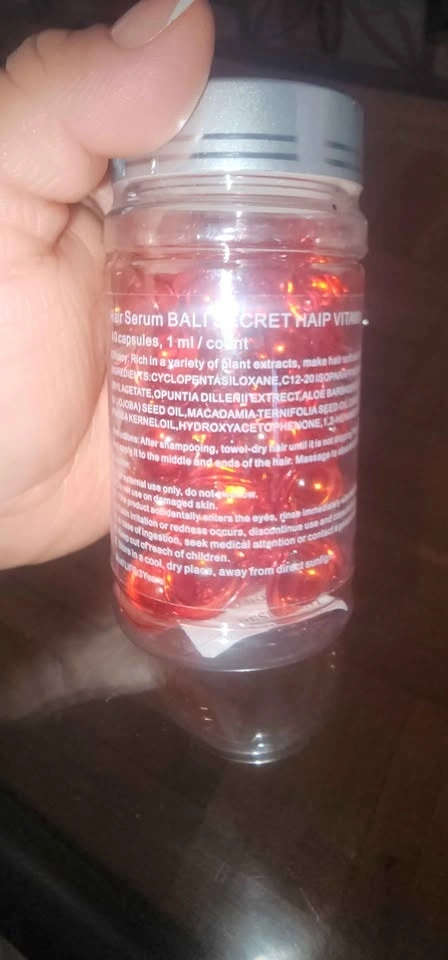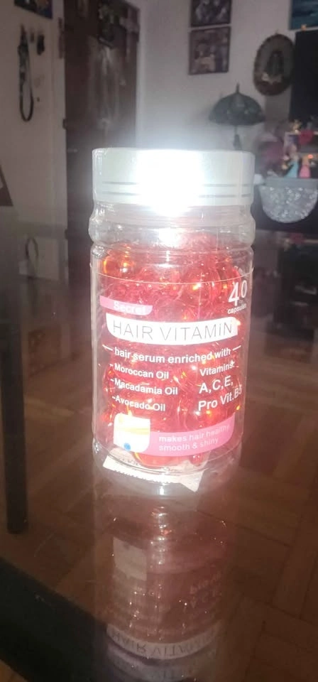 Hair vitamin oil capsules for your hair. After shampooing, towel dry, use a capsule and apply from middle to ends of your hair. It is enriched with Moroccan, Macadamia, and Avocado oils. It includes Vitamins A, C, E, and Pro-Vitamin B5. The serum is designed to make hair healthy, smooth, and shiny without needing to be rinsed out. 40 capsules. Retail price: $20.