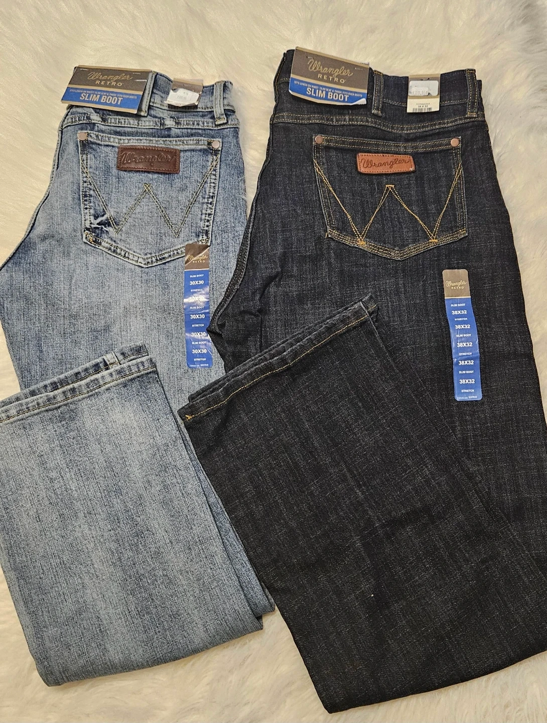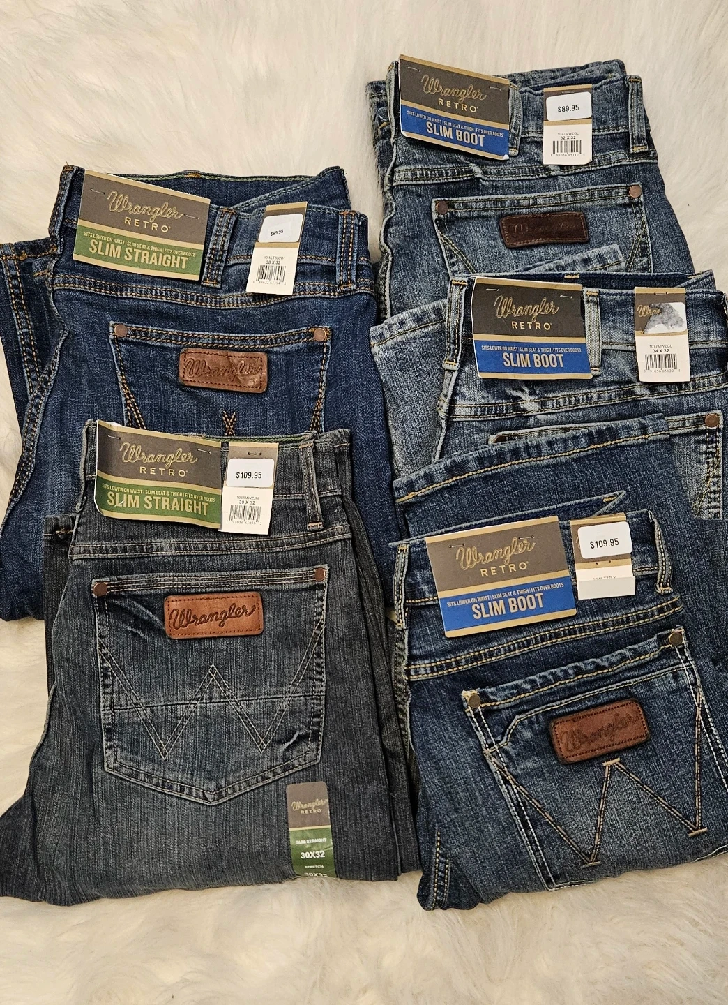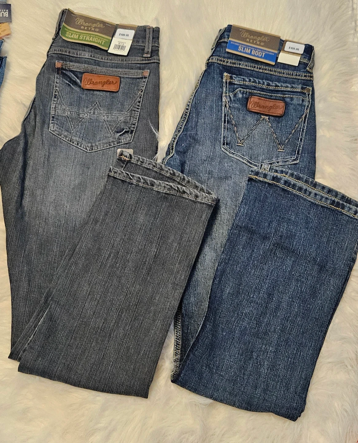 Pairs of brand new Wrangler Retro jeans, Slim Straight and Slim Boot cut. Ready for a new home!