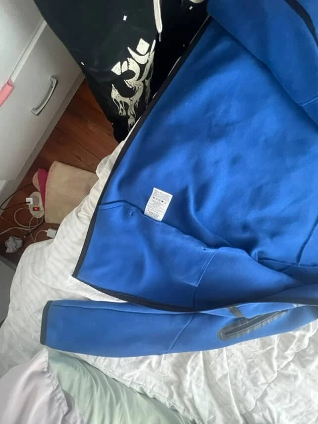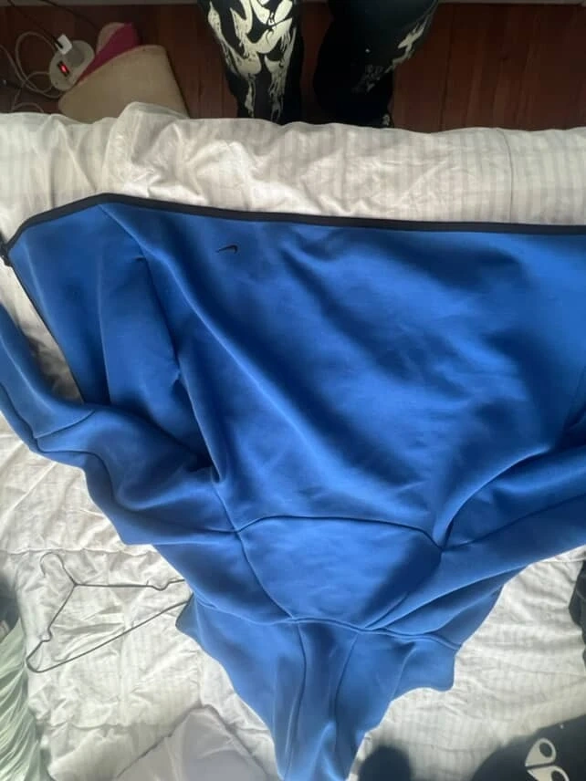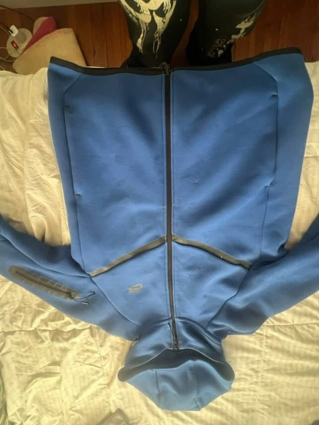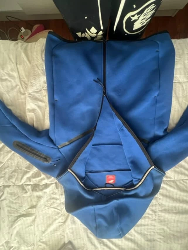 This is a blue Nike Tech Fleece full-zip hoodie. It's made from a soft, warm fabric and features a full zipper closure. Multiple zippered pockets offer secure storage. It's great for staying comfortable during workouts or casual wear.