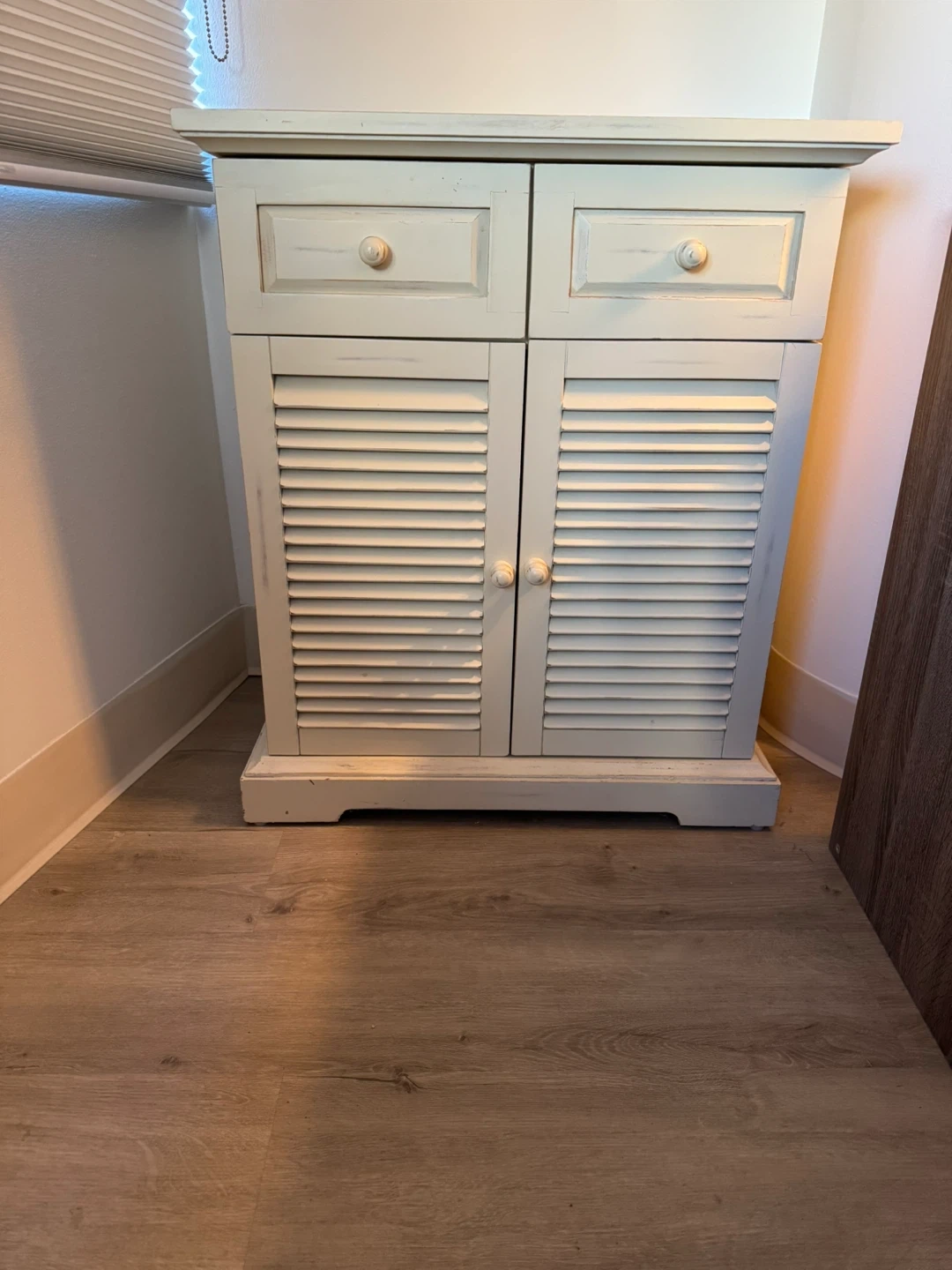 This Pier 1 Imports cabinet offers storage with two drawers on top and two louvered doors below. It's a light, neutral color that fits most decor.