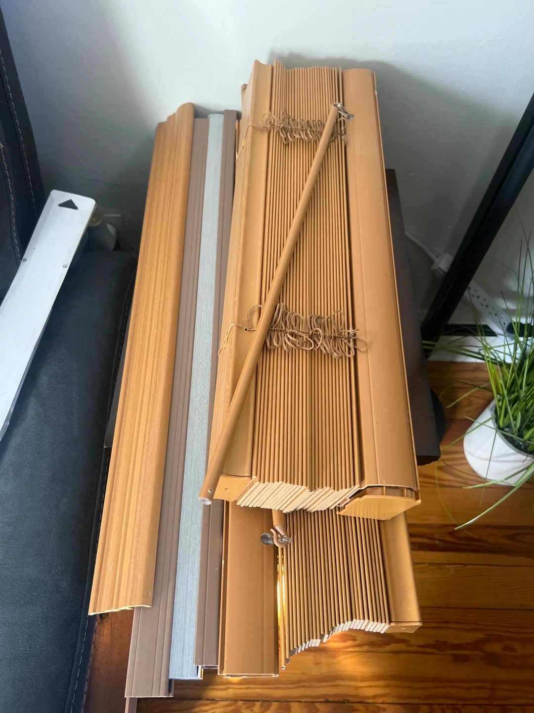 Cordless faux wood blinds in a light brown color. Includes a wooden wand for operation. The blinds are 2 inches wide and designed for indoor windows.