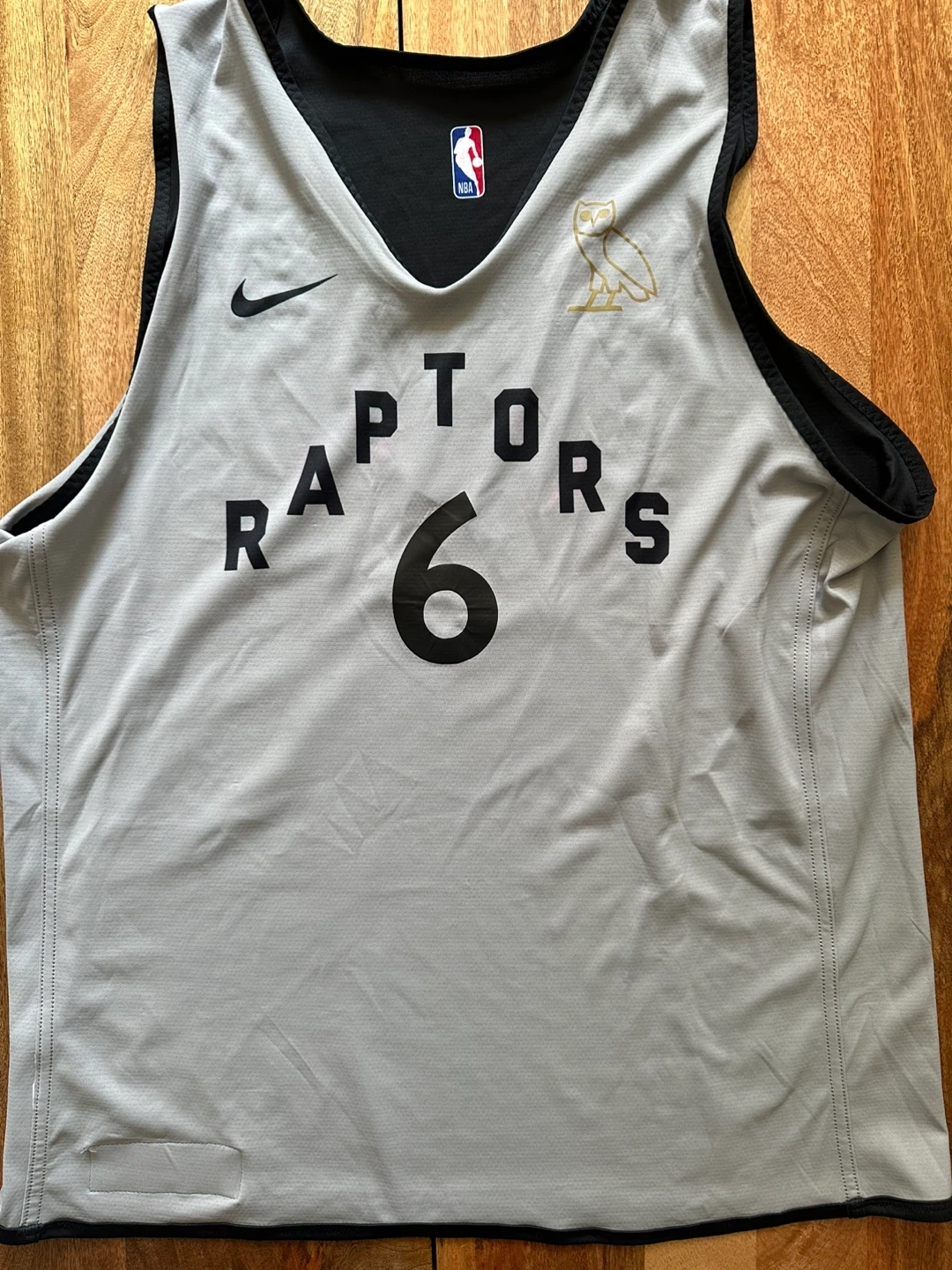 Selling a Nike reversible Raptors OVO jersey in size XL. It features the Raptors logo with the number 6 and the OVO owl. Available in both gray and black.
