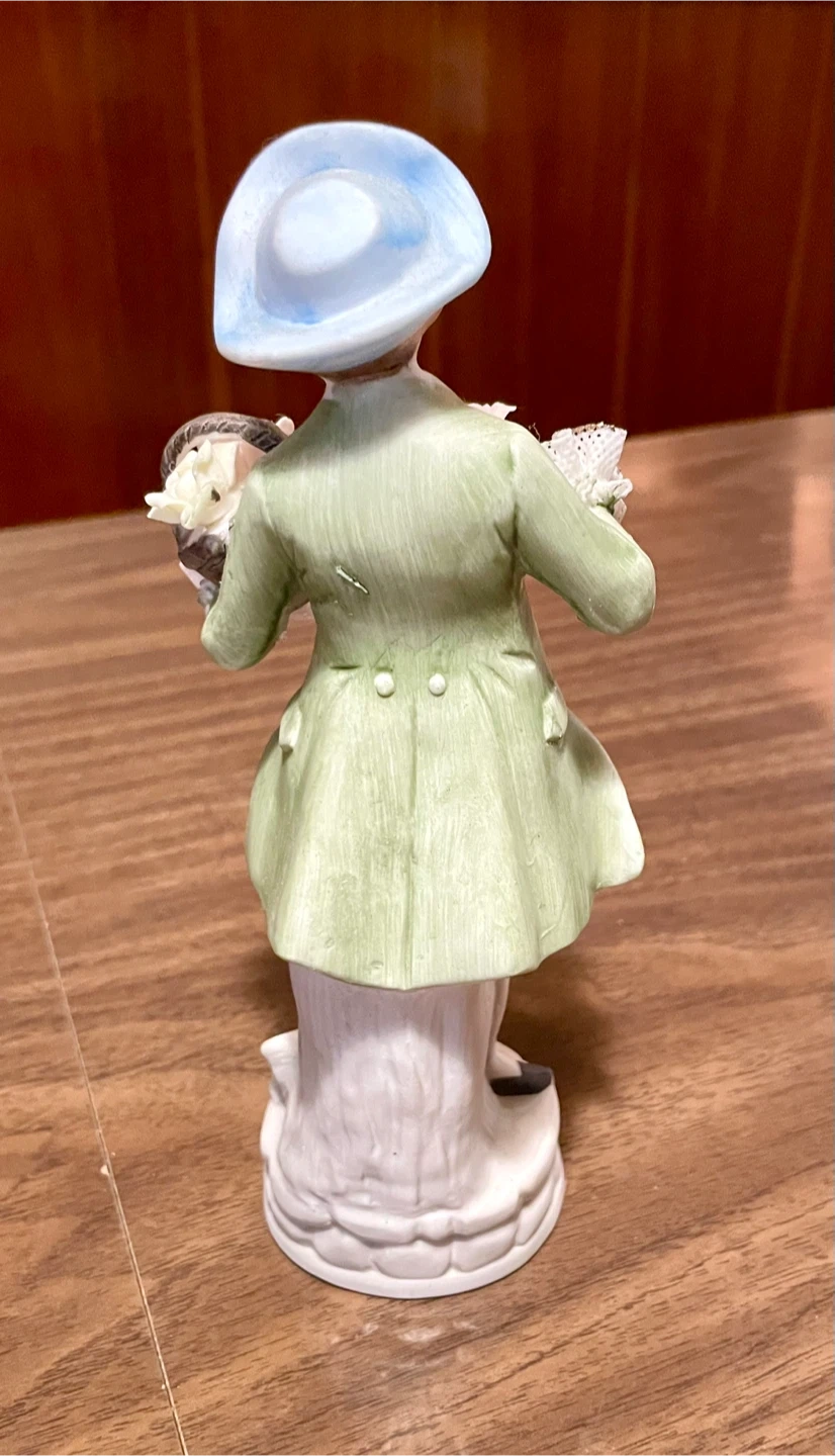 This is a collectable charming bisque porcelain figurine depicting a gentleman in 18th century attire in soft pastel colours. He is wearing a frilled white lace blouse under a pale yellow vest, light blue hat and trousers, and a light green overcoat. He holds a basket with a large pale pink flower in one hand and a rose in the other.