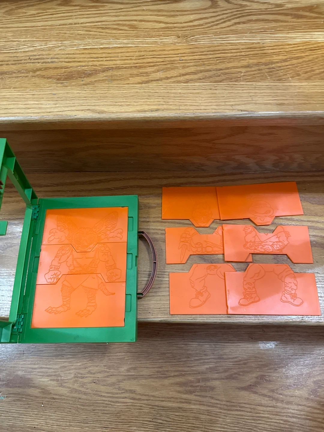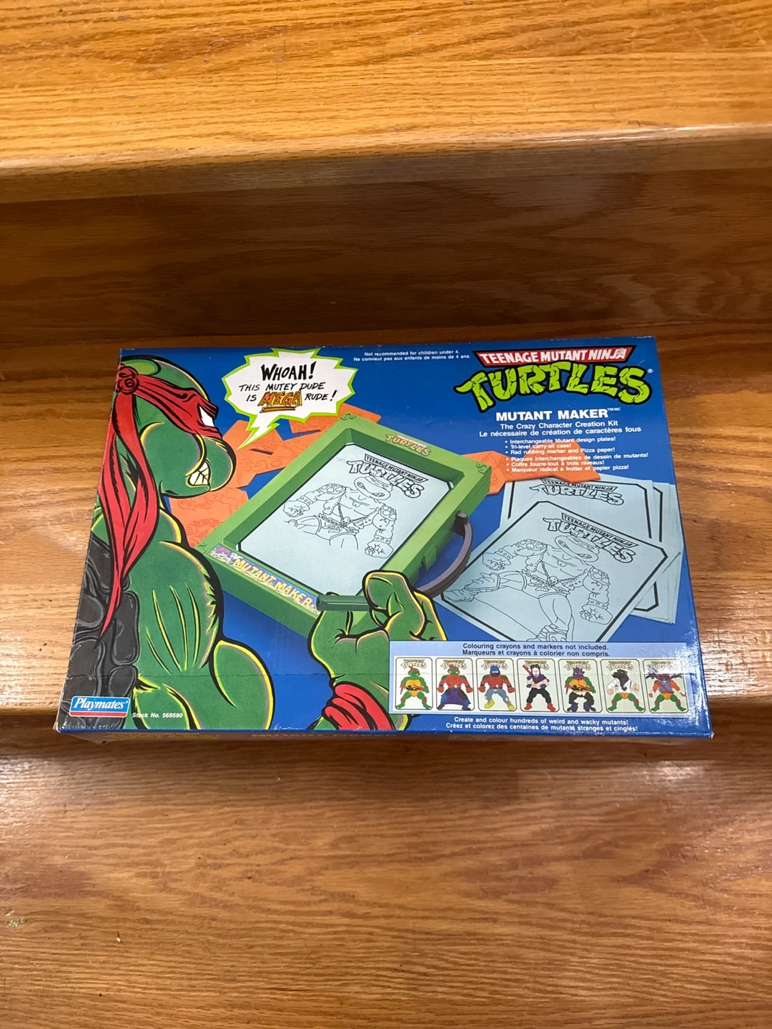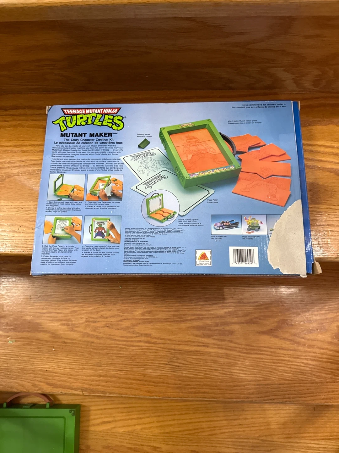 Create your own mutant turtles! This 1990 vintage toy lets you mix and match body parts to make unique characters. It includes the green maker case with orange insert plates and six additional plates with different characters on both sides. Crayon holder and 2 crayons. Hours of creative fun for any TMNT fan!