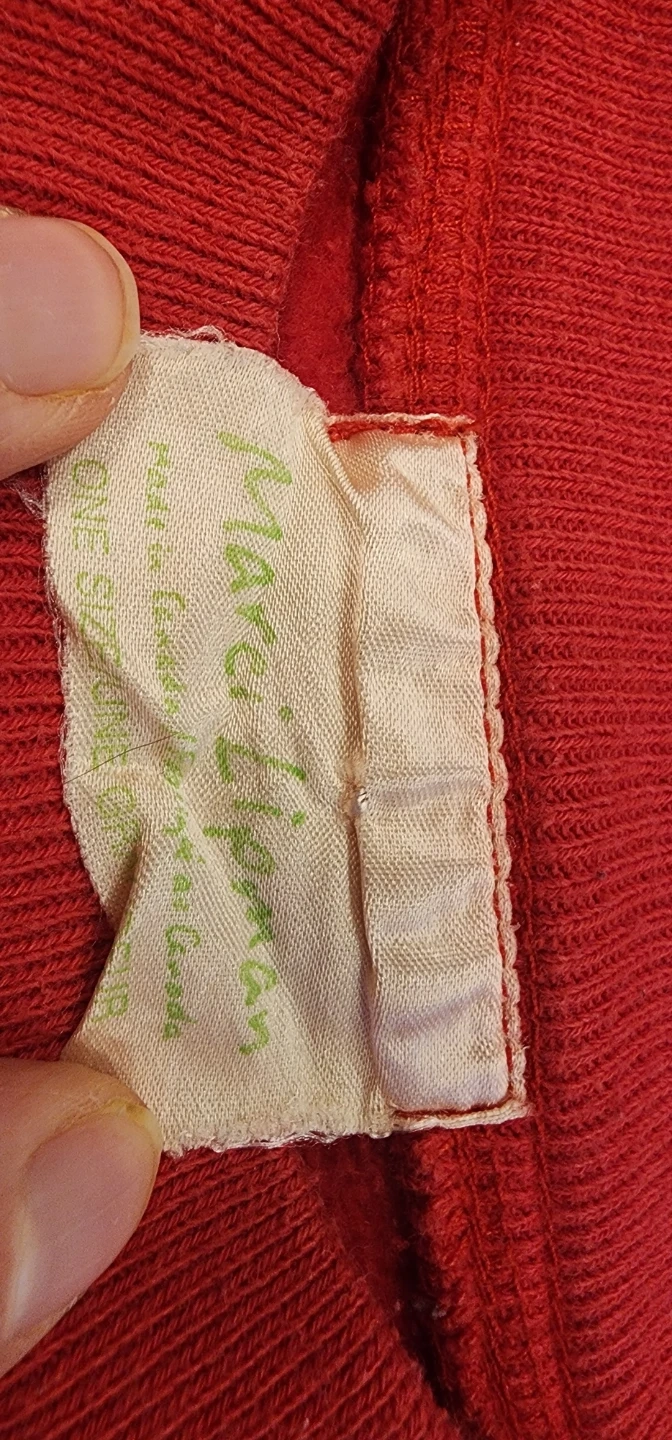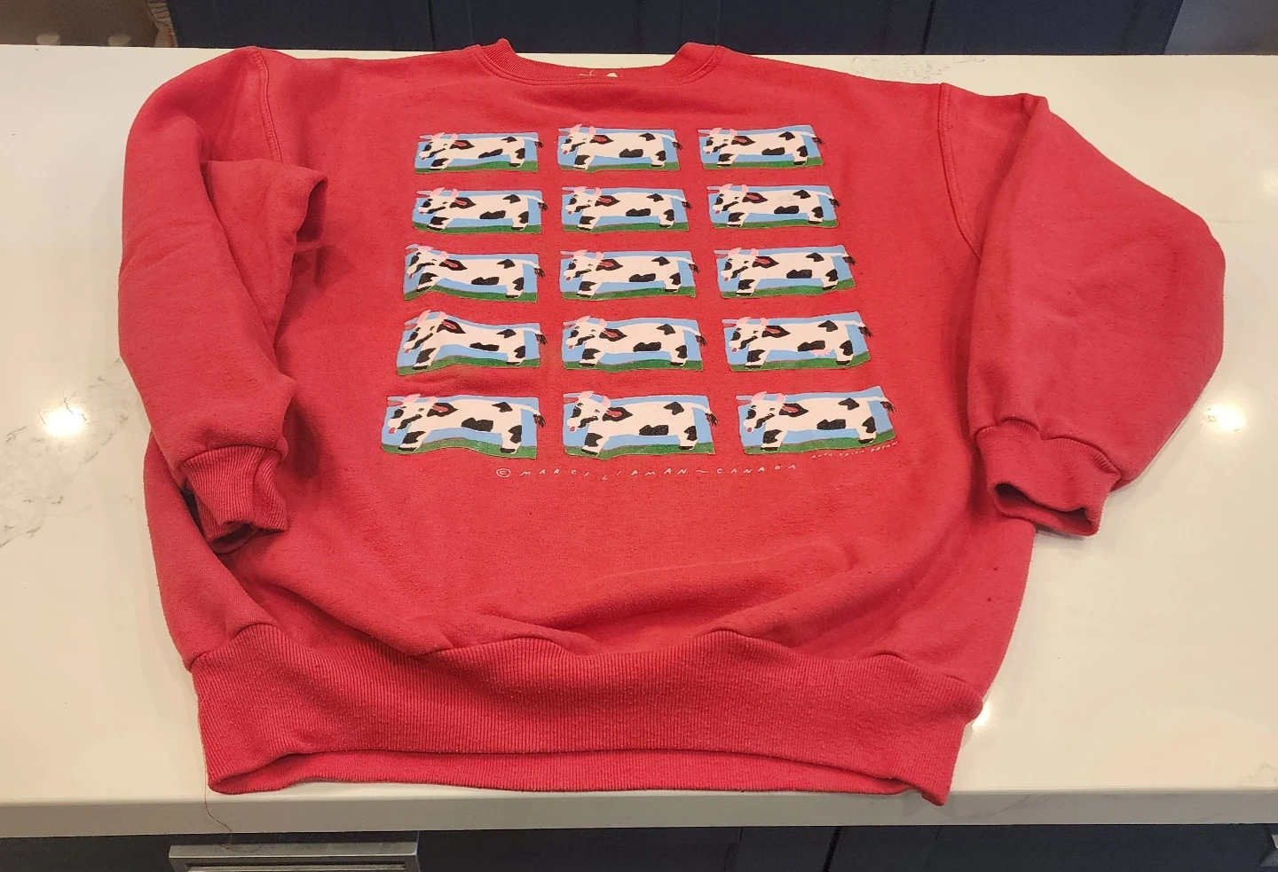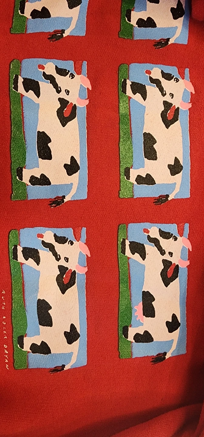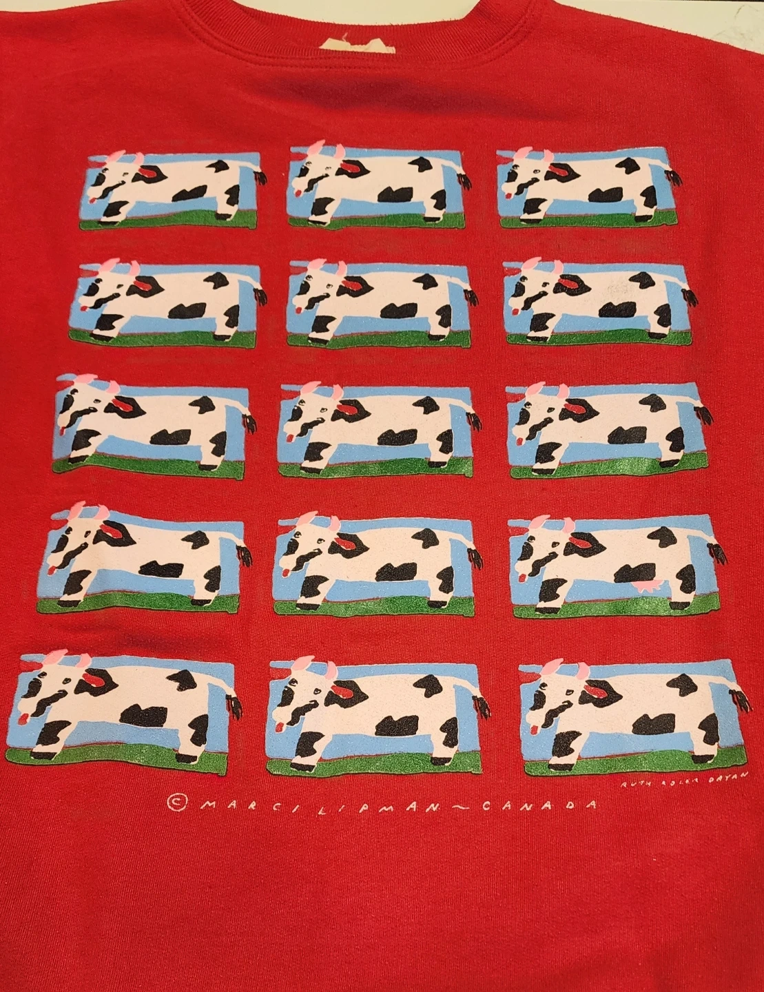 This red sweatshirt features a fun front print of cows (only one with utters). It's made by Marci Lipman Canada.