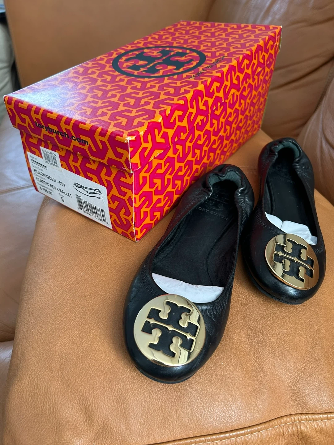 Tory Burch Classic Reva ballet flats in black leather with a gold logo detail. Includes the original box. Leather upper and lining.