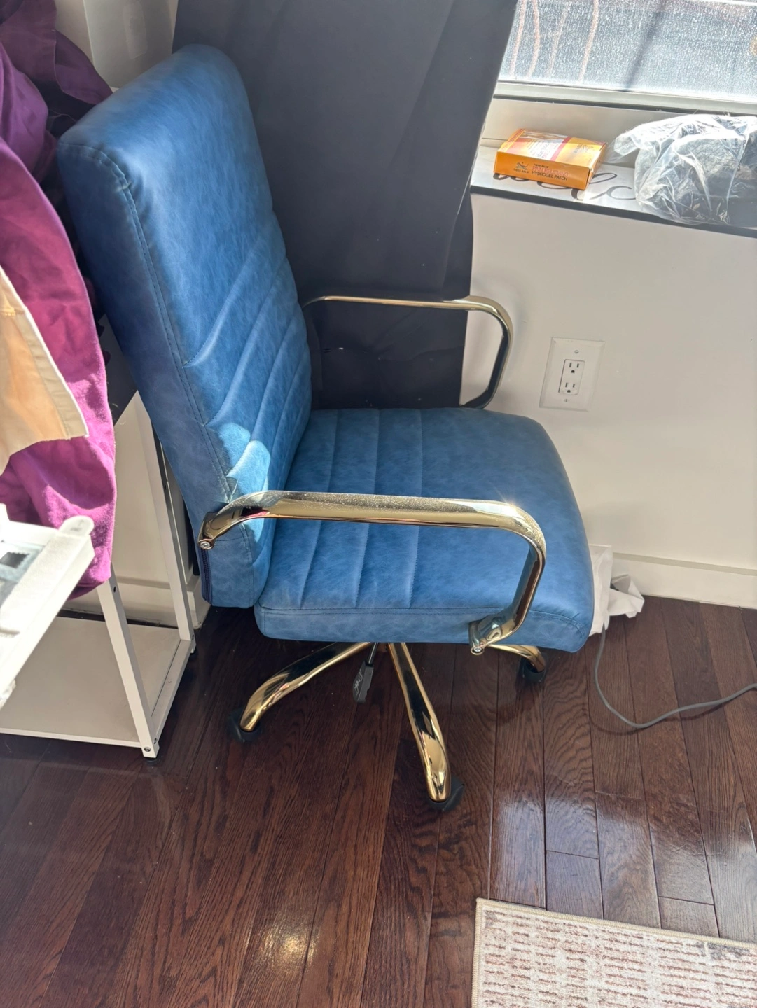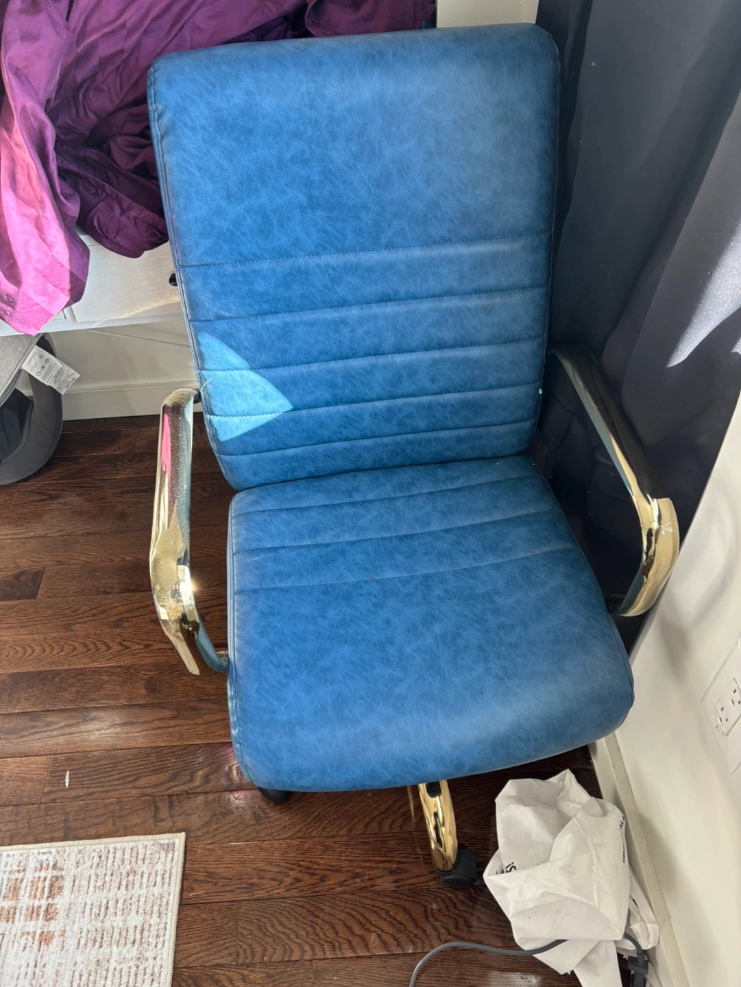 Comfortable office chair, blue faux leather, gold-toned metal arms and base. Swivel function, rolling casters. Good for home or office. Pickup only in Astoria