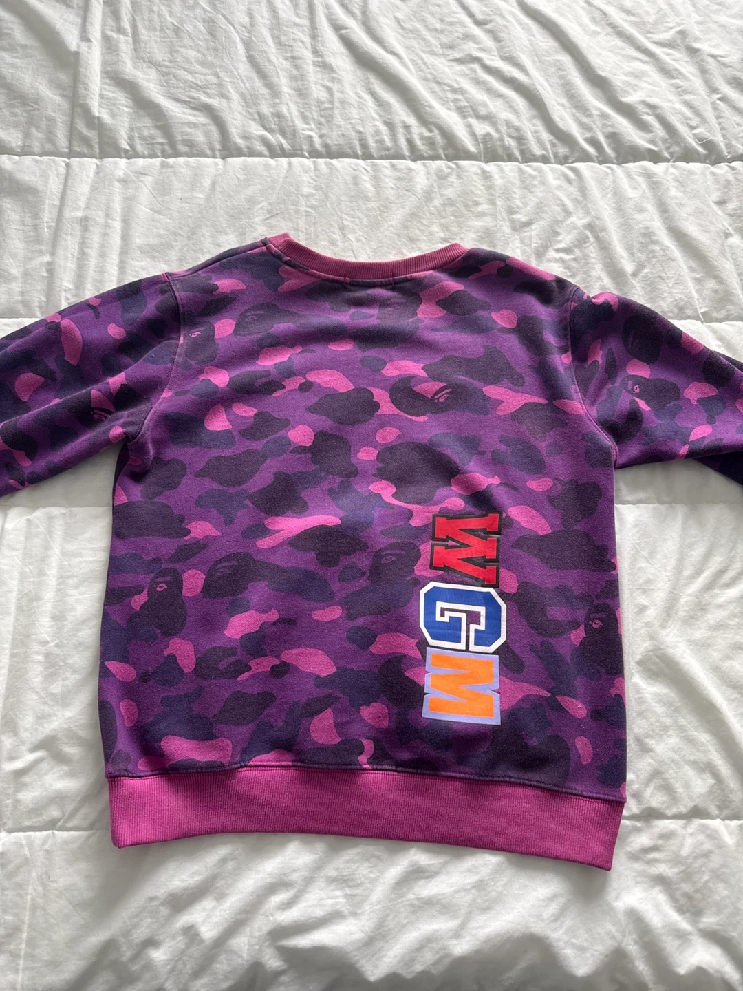 This is an A Bathing Ape crewneck sweatshirt featuring the iconic shark camouflage design in purple. It's a size medium with ribbed cuffs and hem. This colourful piece is great for adding some bold style to your wardrobe!