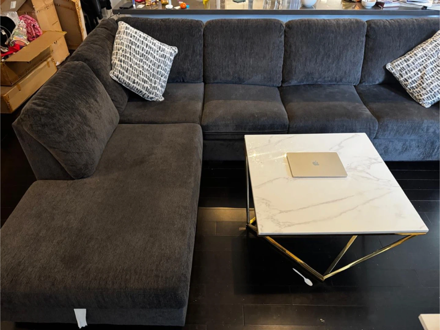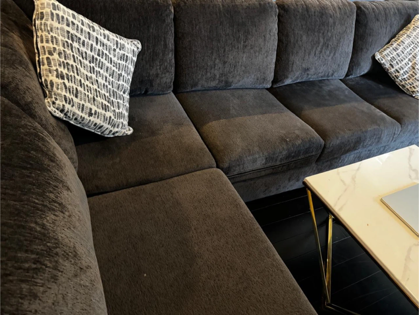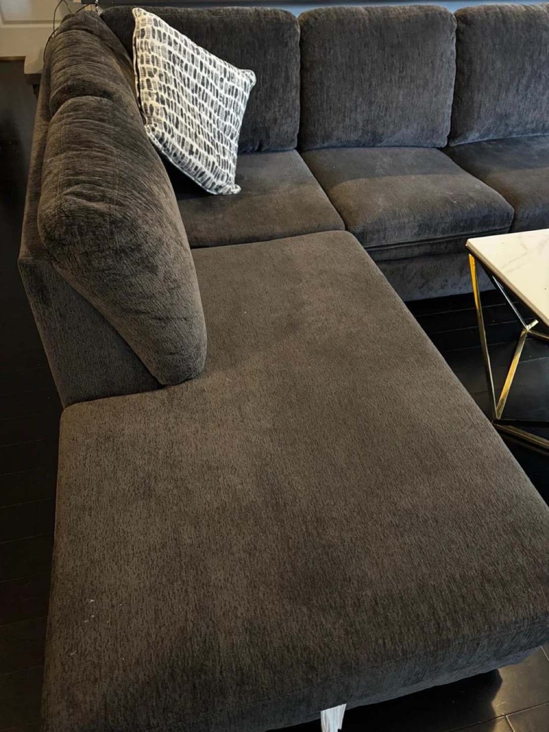 Comfortable dark gray sectional sofa. Upholstered in a soft fabric. Plenty of seating space for family and guests!