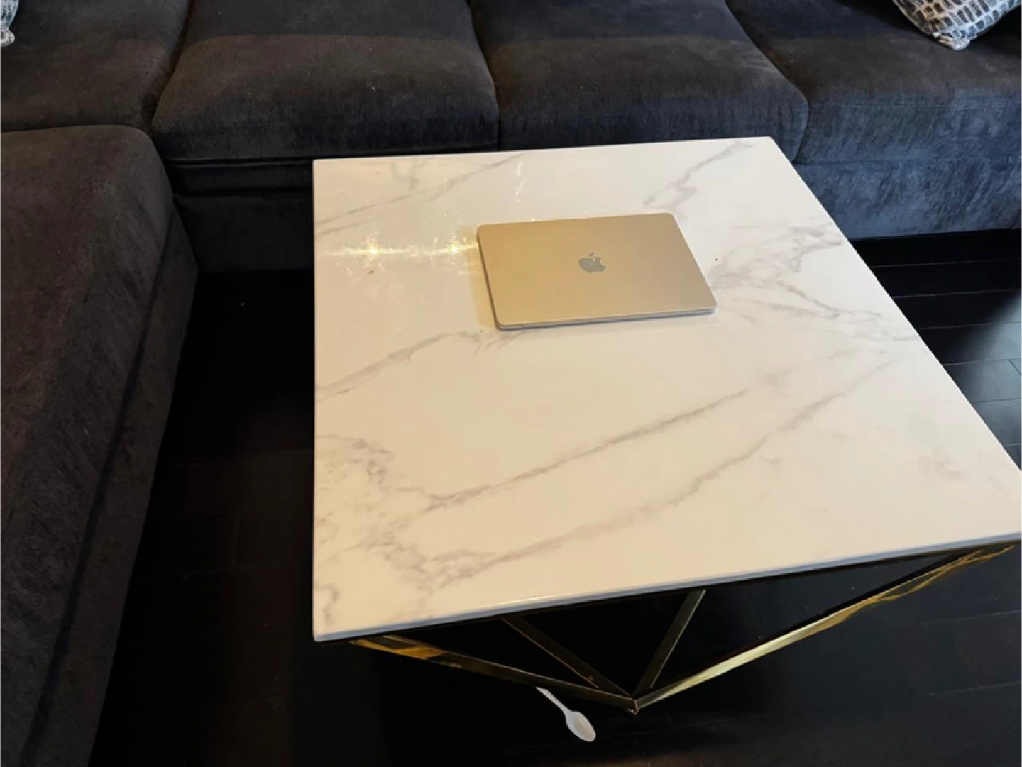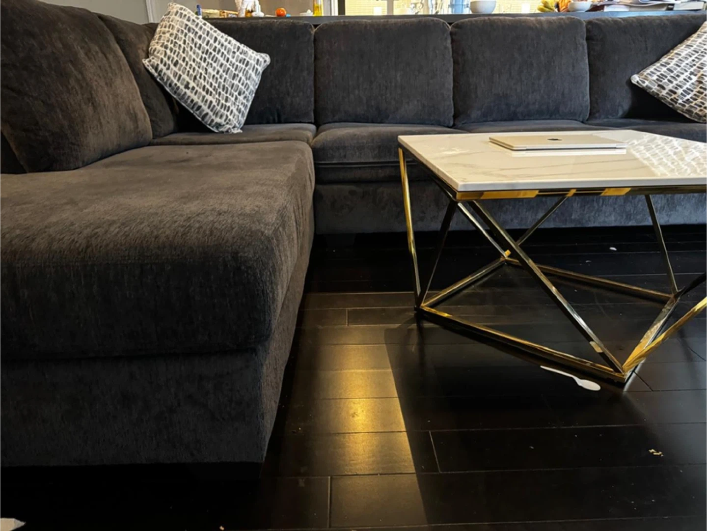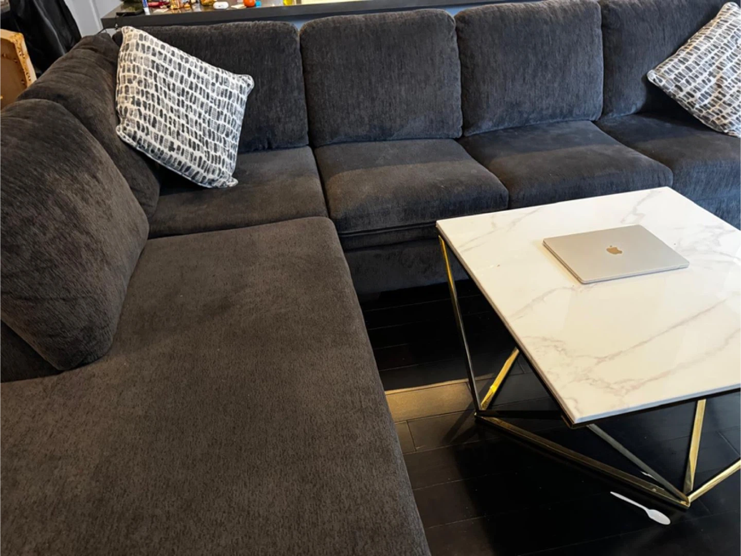 Comfortable dark gray sectional sofa. Upholstered in a soft fabric. Plenty of seating space for family and guests!