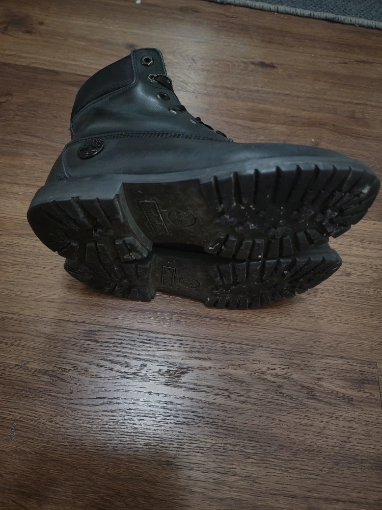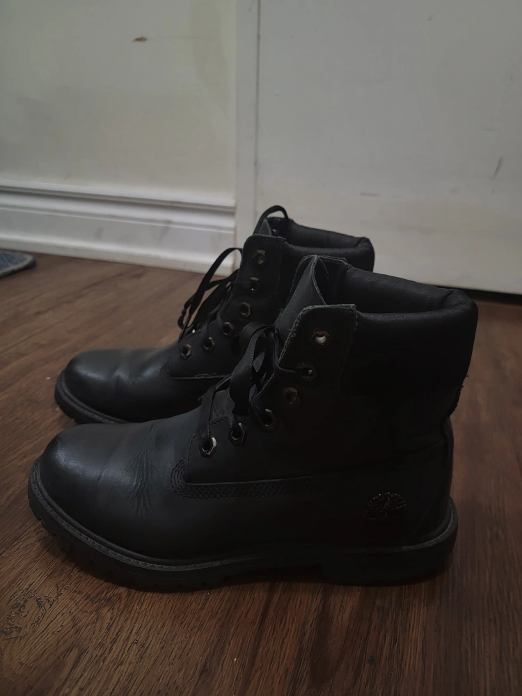 Pair of black leather timberland boots, great for winters or rainy season.