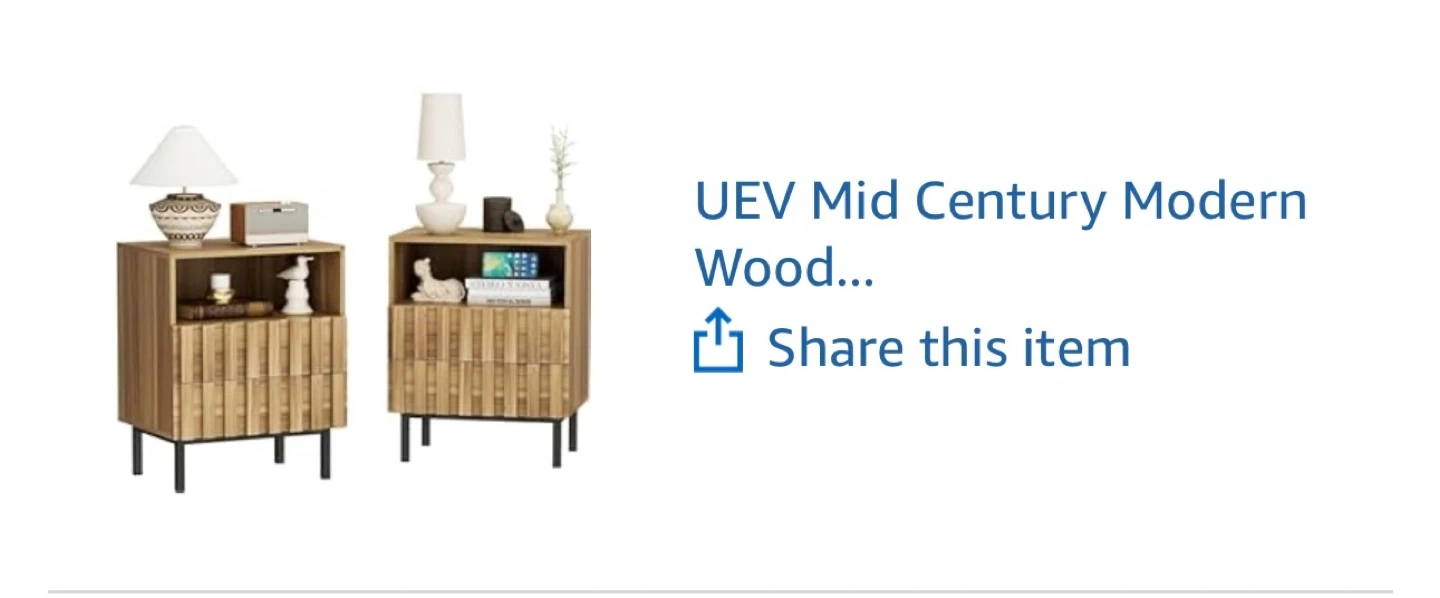 Set of TWO- This UEV nightstand features a mid-century modern design with fluted drawer fronts and black metal legs. It includes one open shelf and two drawers for storage. Wood construction.