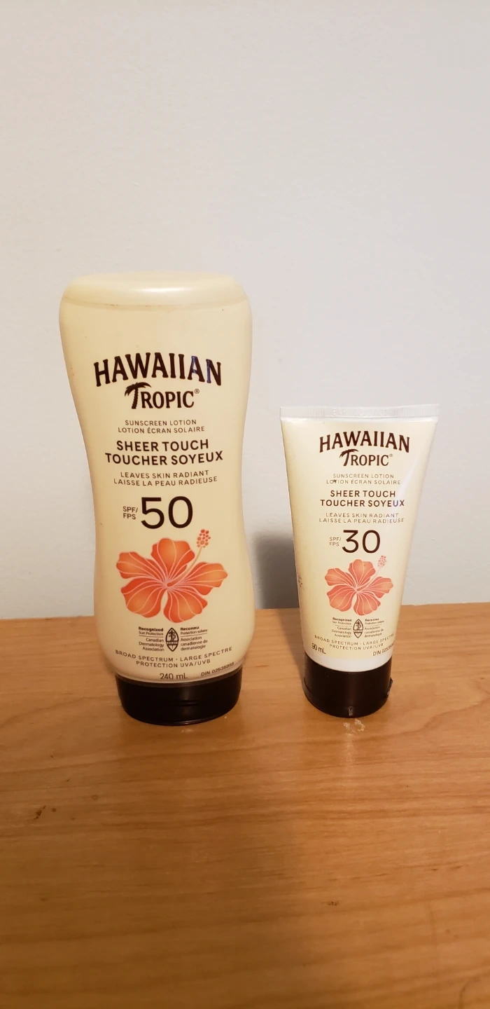 Two bottles of Hawaiian Tropic Sheer Touch sunscreen lotion. Includes a 240 mL bottle with SPF 50 and a 90 mL bottle with SPF 30. Both offer broad-spectrum UVA/UVB protection and leave skin radiant.