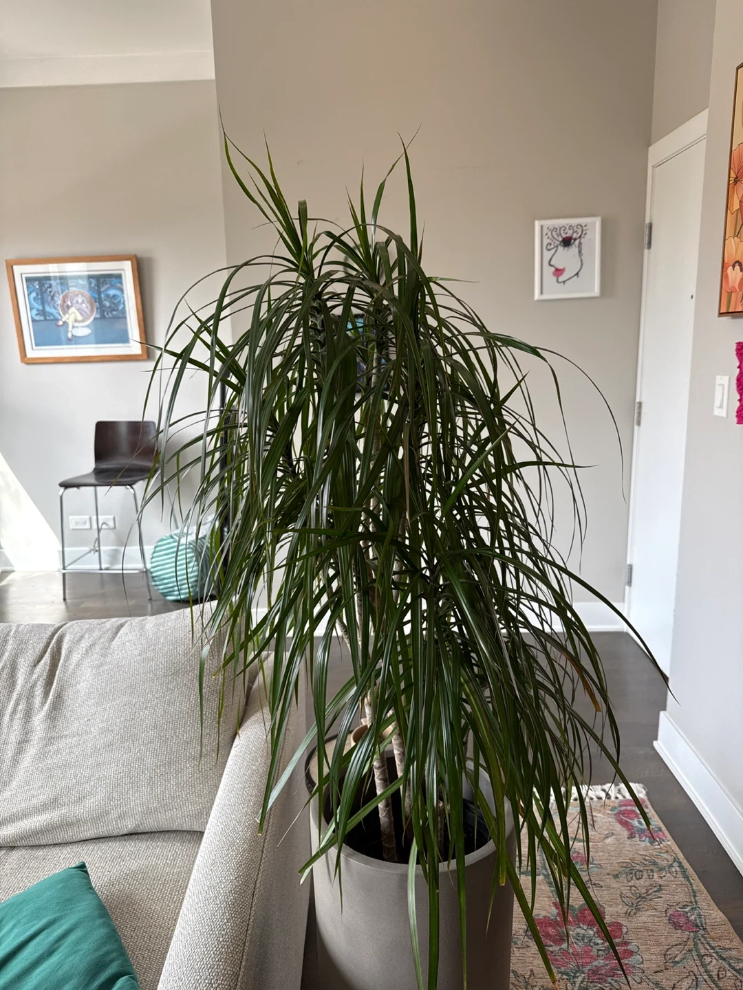 A healthy Dracaena Marginata plant with long, sword-like leaves. It's planted in a modern gray pot with a pot stand. This plant adds a touch of greenery to any indoor space.