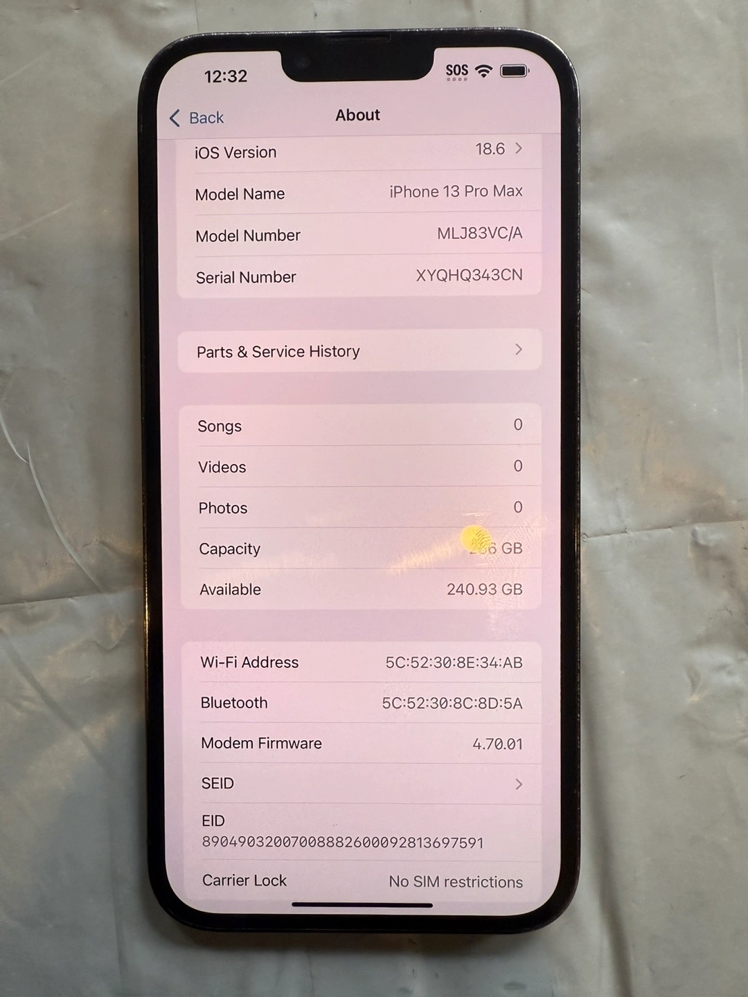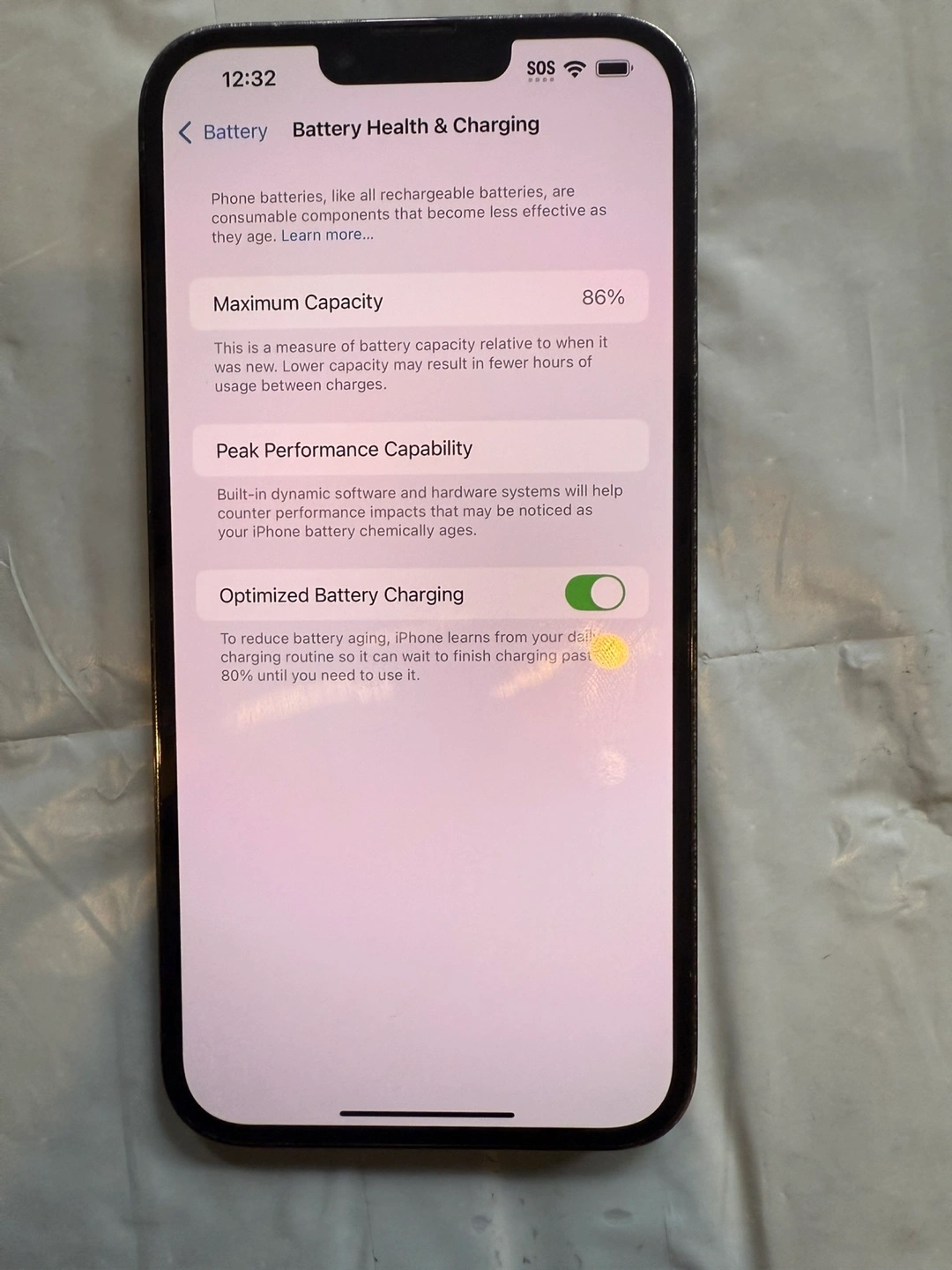 Selling an iPhone 13 Pro Max with 256GB of storage. The battery health is at 86%. Model number is MLJ83VC/A.