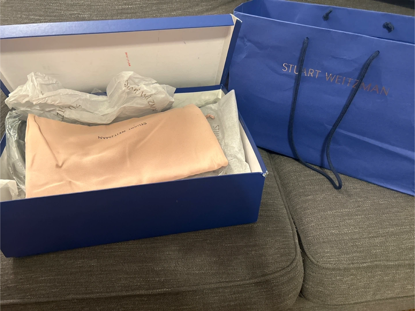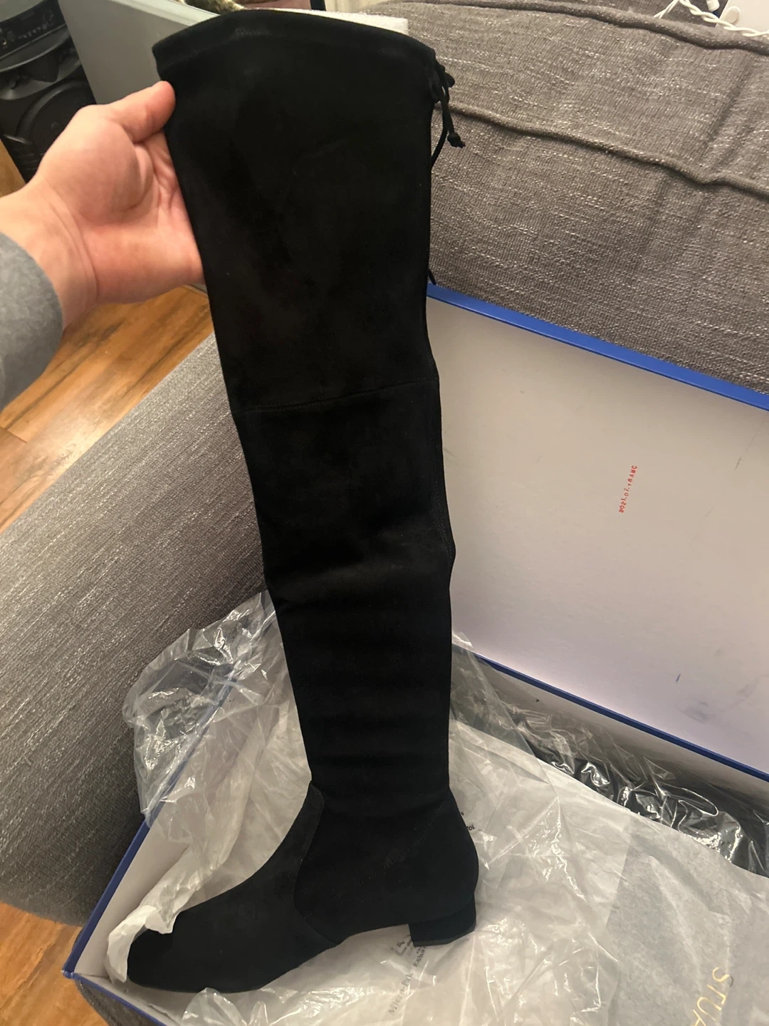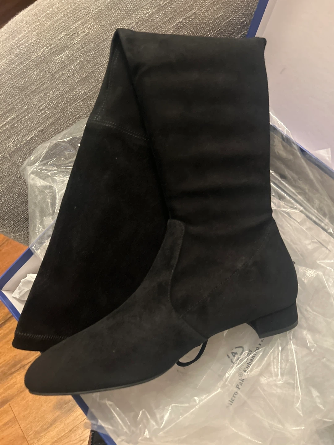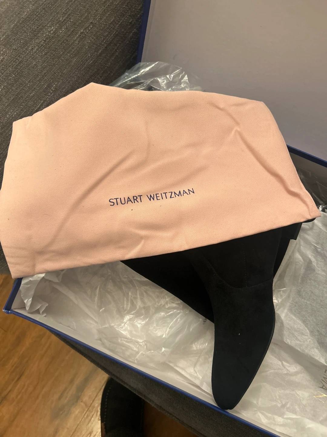 These are Stuart Weitzman over-the-knee boots. They're made of black suede material and come with their original box and dust bag. Perfect for a stylish and warm addition to your fall and winter wardrobe!