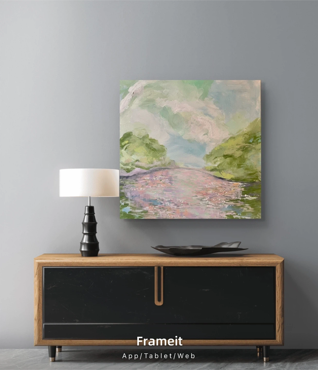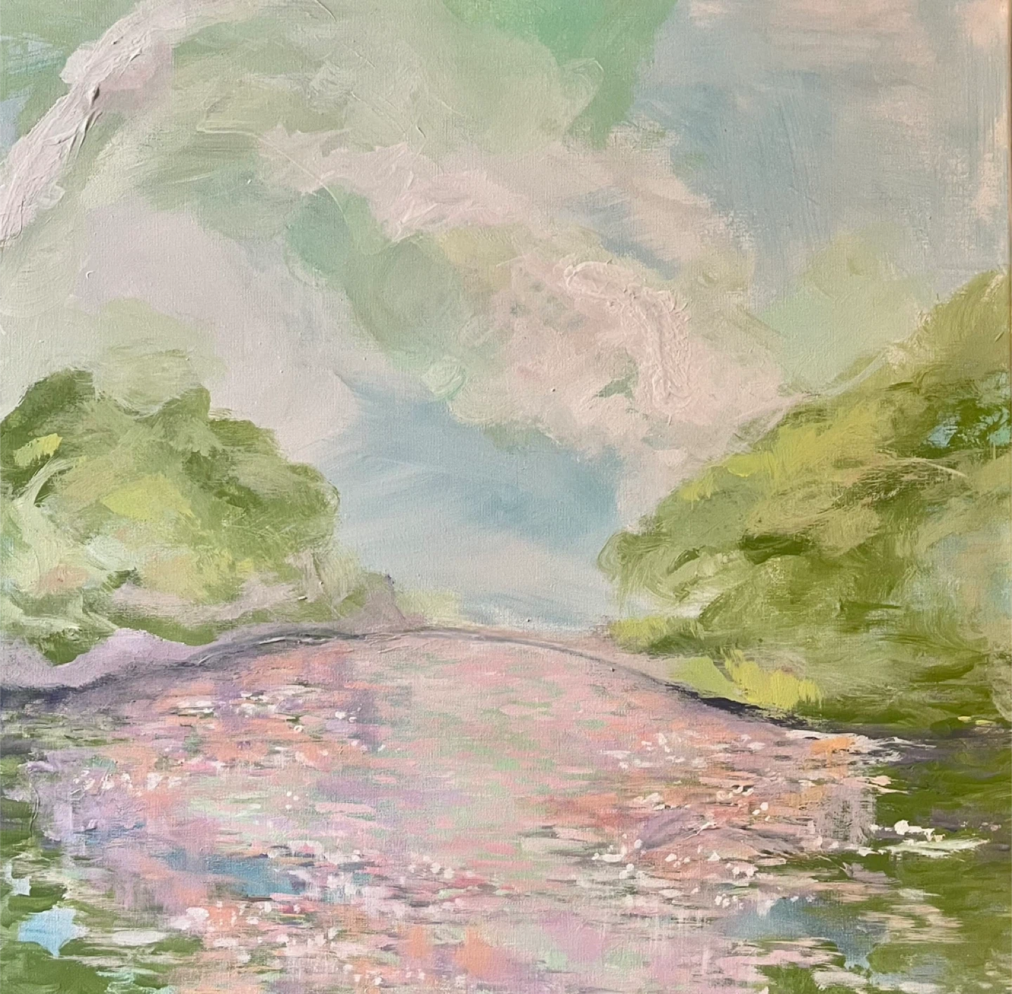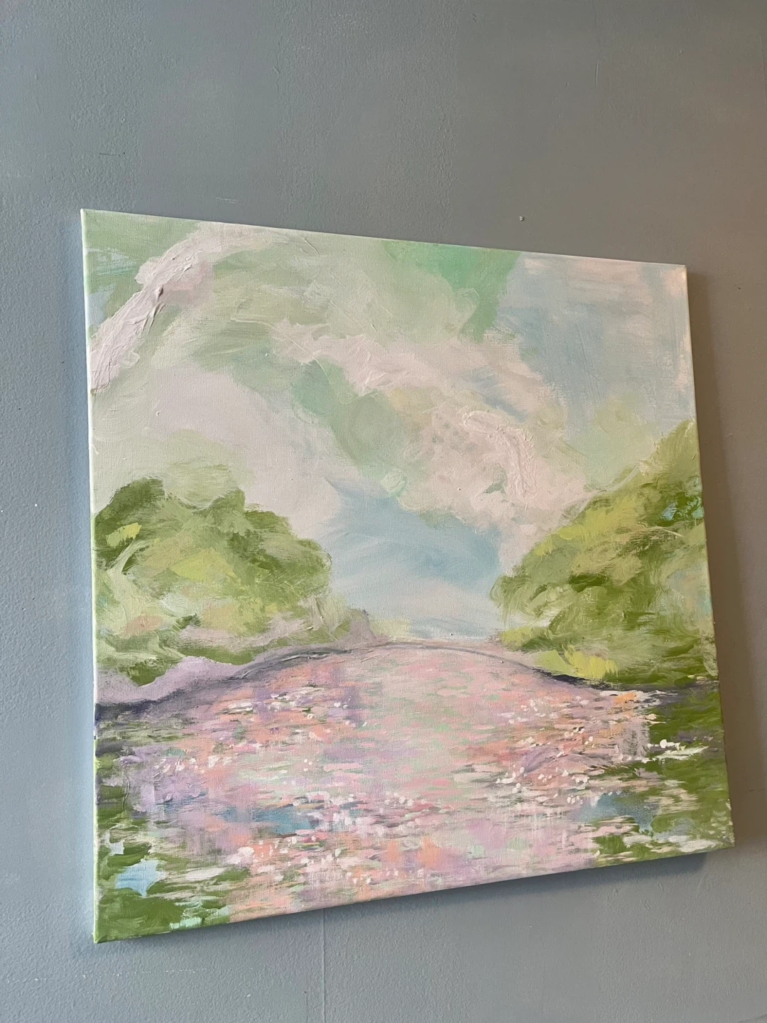 Canvas art with a serene abstract landscape. It features soft pastel colours depicting trees and water. This piece's dimensions are 24 inches by 24 inches.
