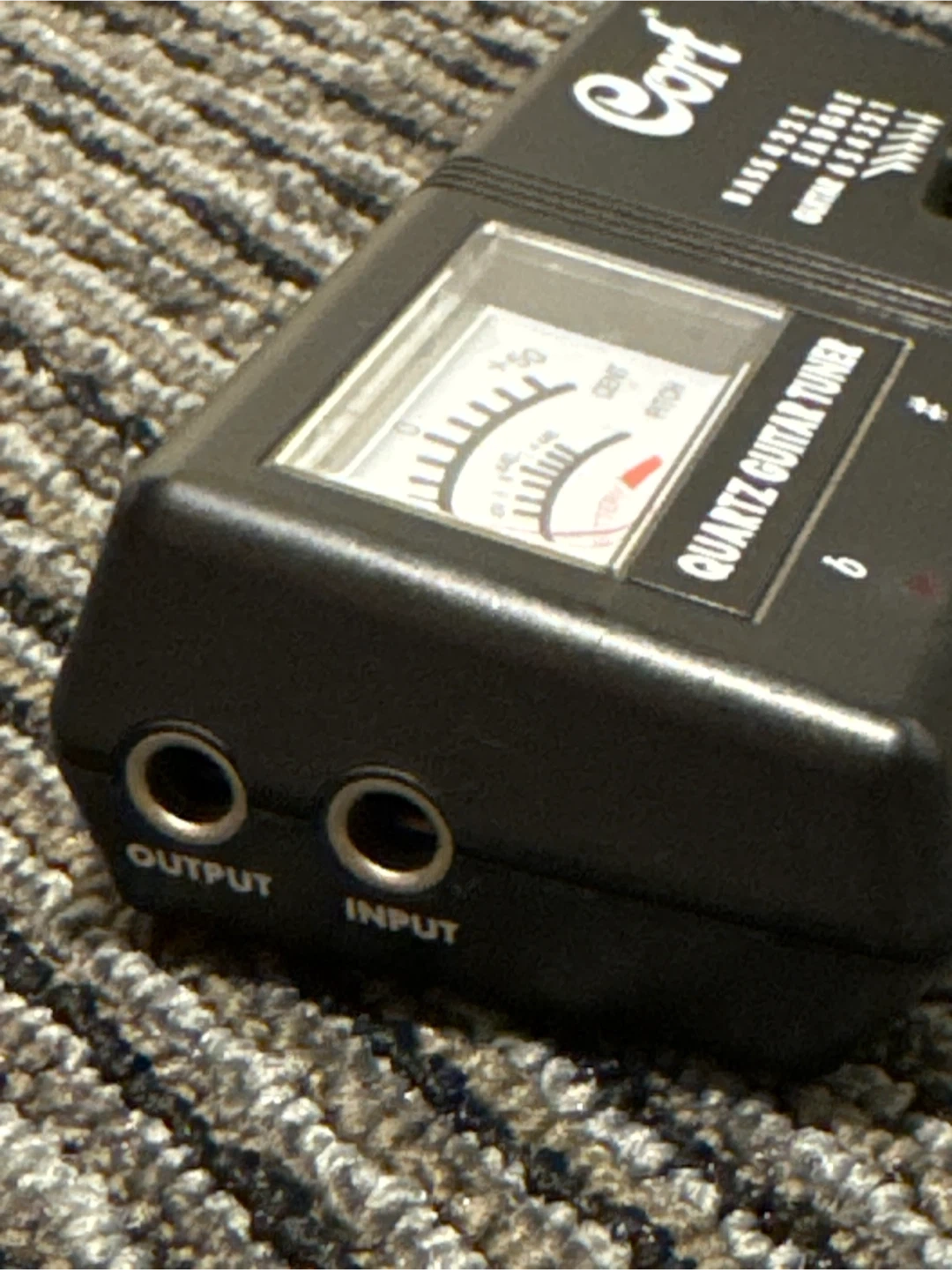 This is a Cort quartz guitar tuner. It features input and output jacks and a built-in microphone for tuning. It's great for guitarists and bassists!