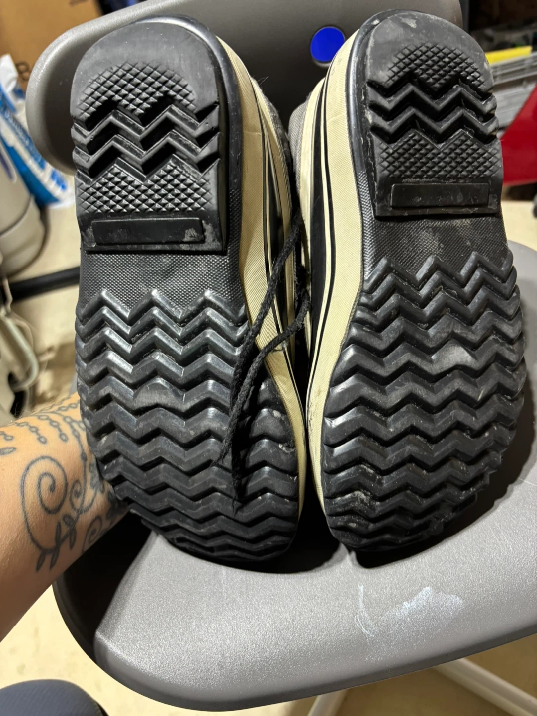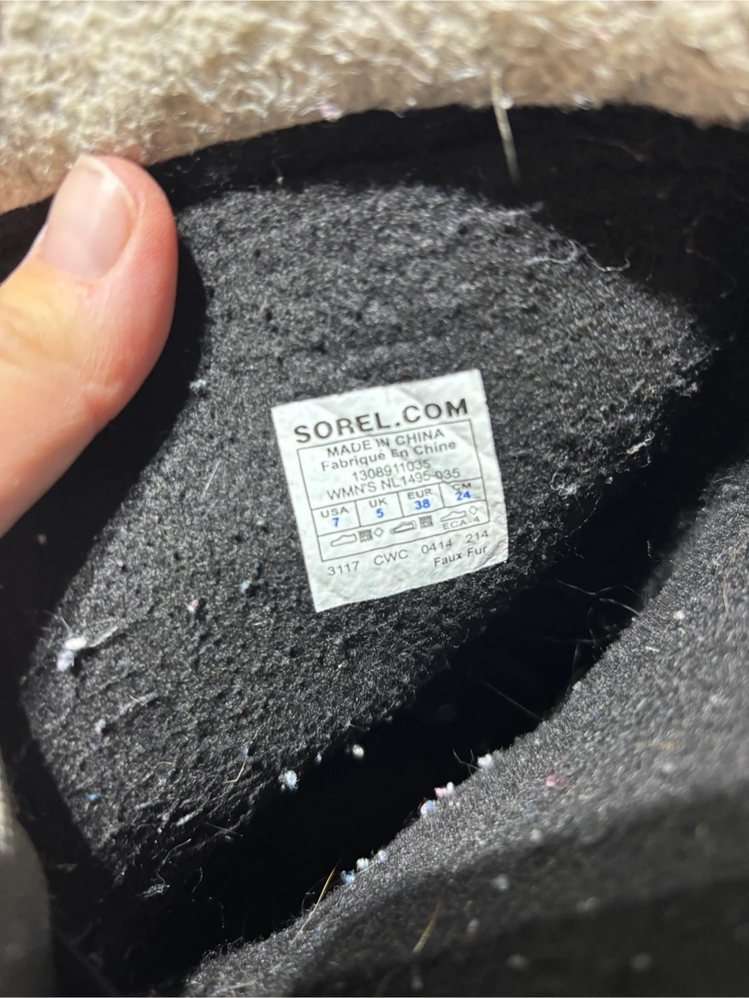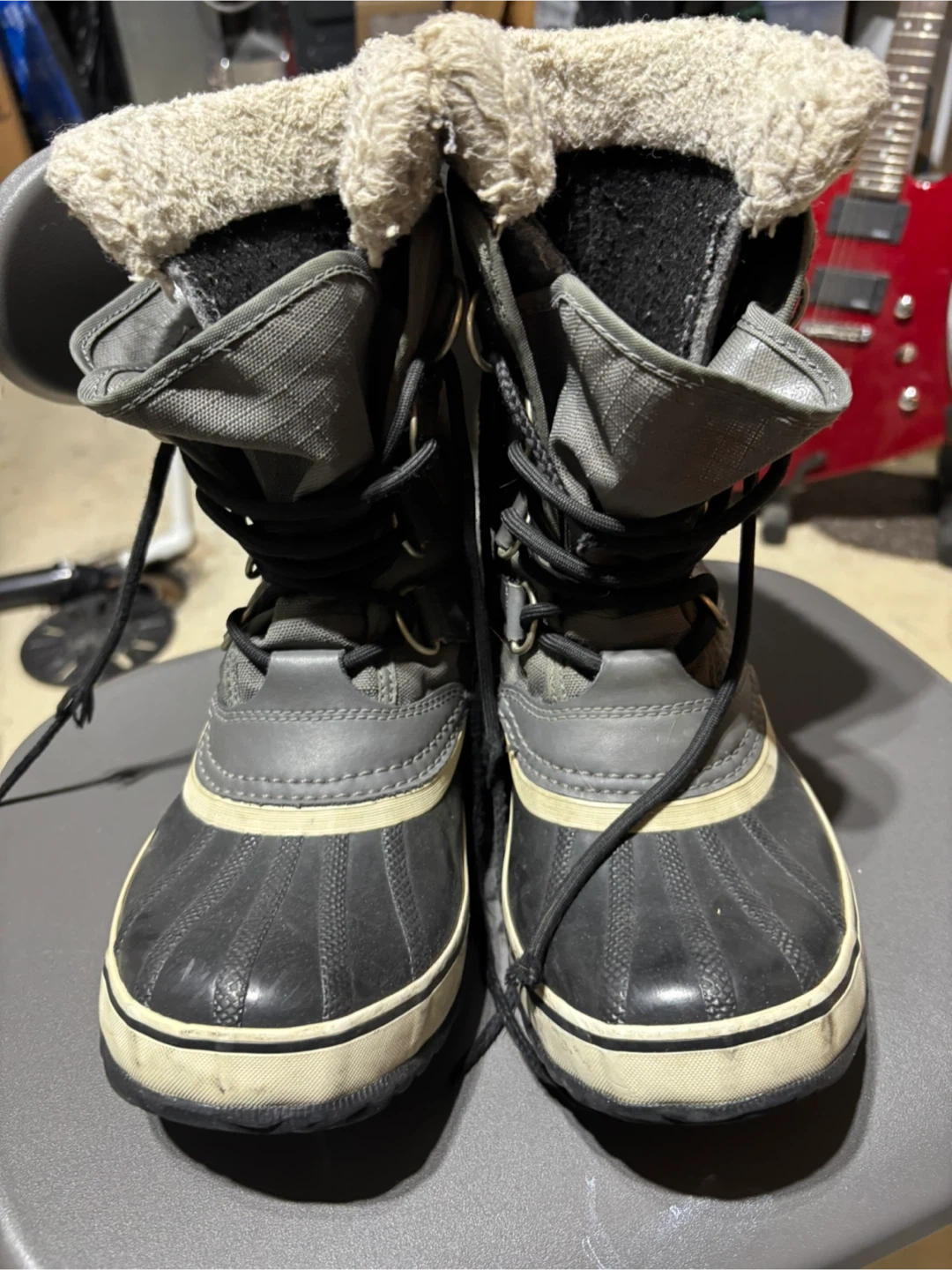 Sorel winter boots in grey and black. Faux fur lining. Women's size 7 (EUR 38, UK 5). These boots are waterproof and built for cold weather.