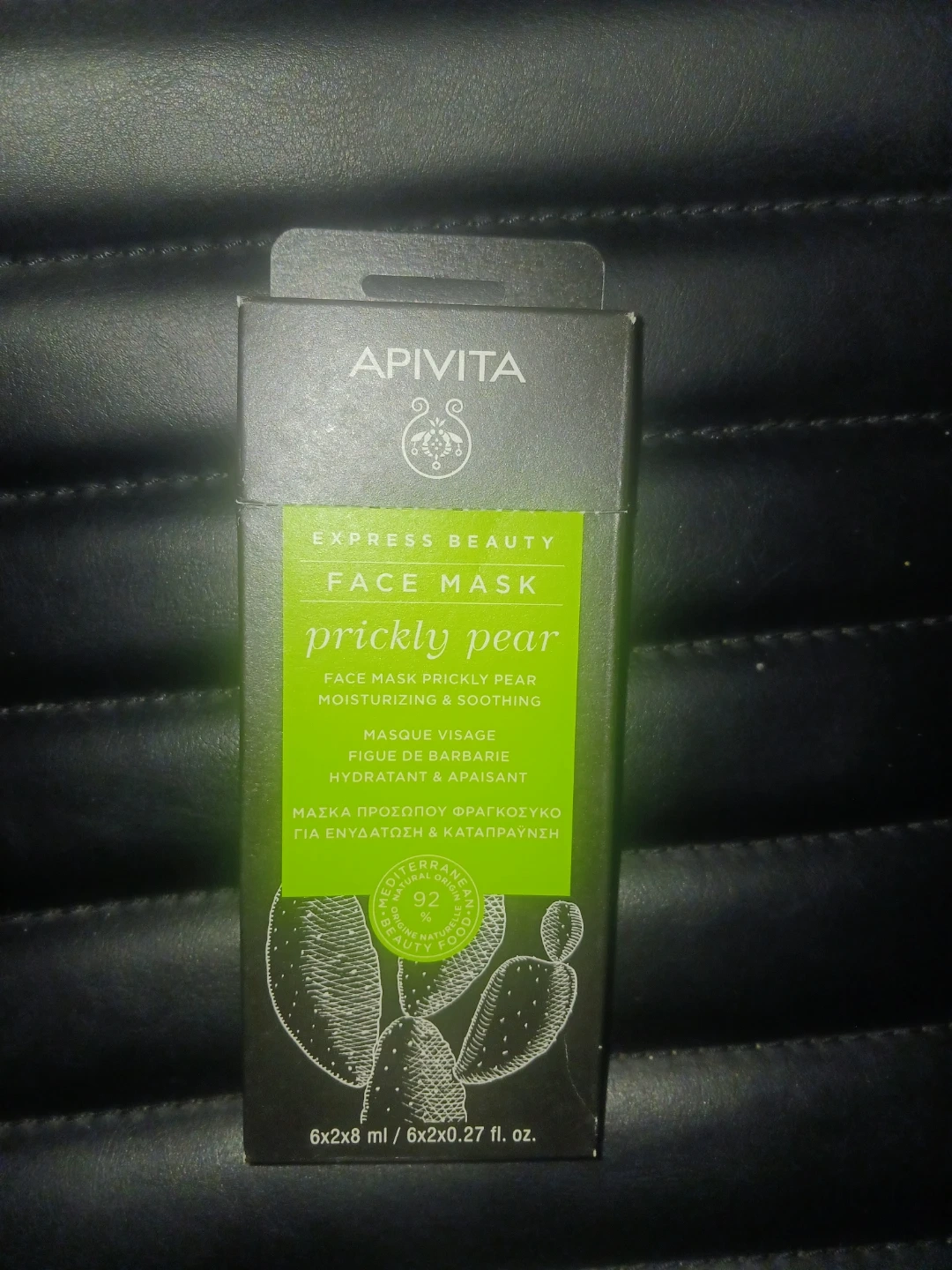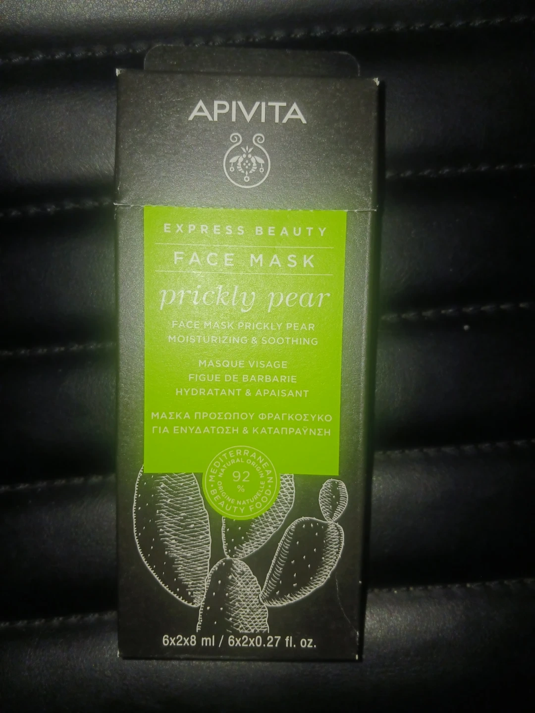 APIVITA Express Beauty Face Mask with Prickly Pear. Moisturizing and soothing formula. Contains 6 individual masks, each 2ml. 92% natural origin ingredients.