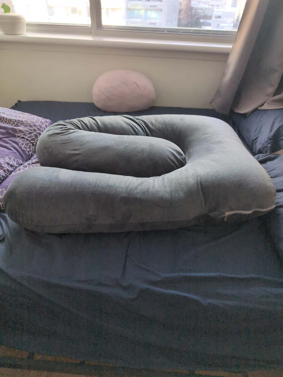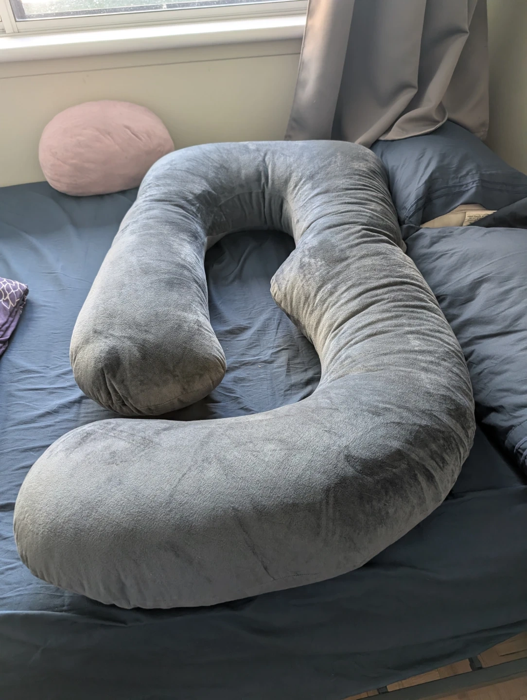 This C-shaped maternity pillow provides full body support. It's covered in a soft grey fabric. Use it for comfort during pregnancy or for general relaxation. In excellent condition!