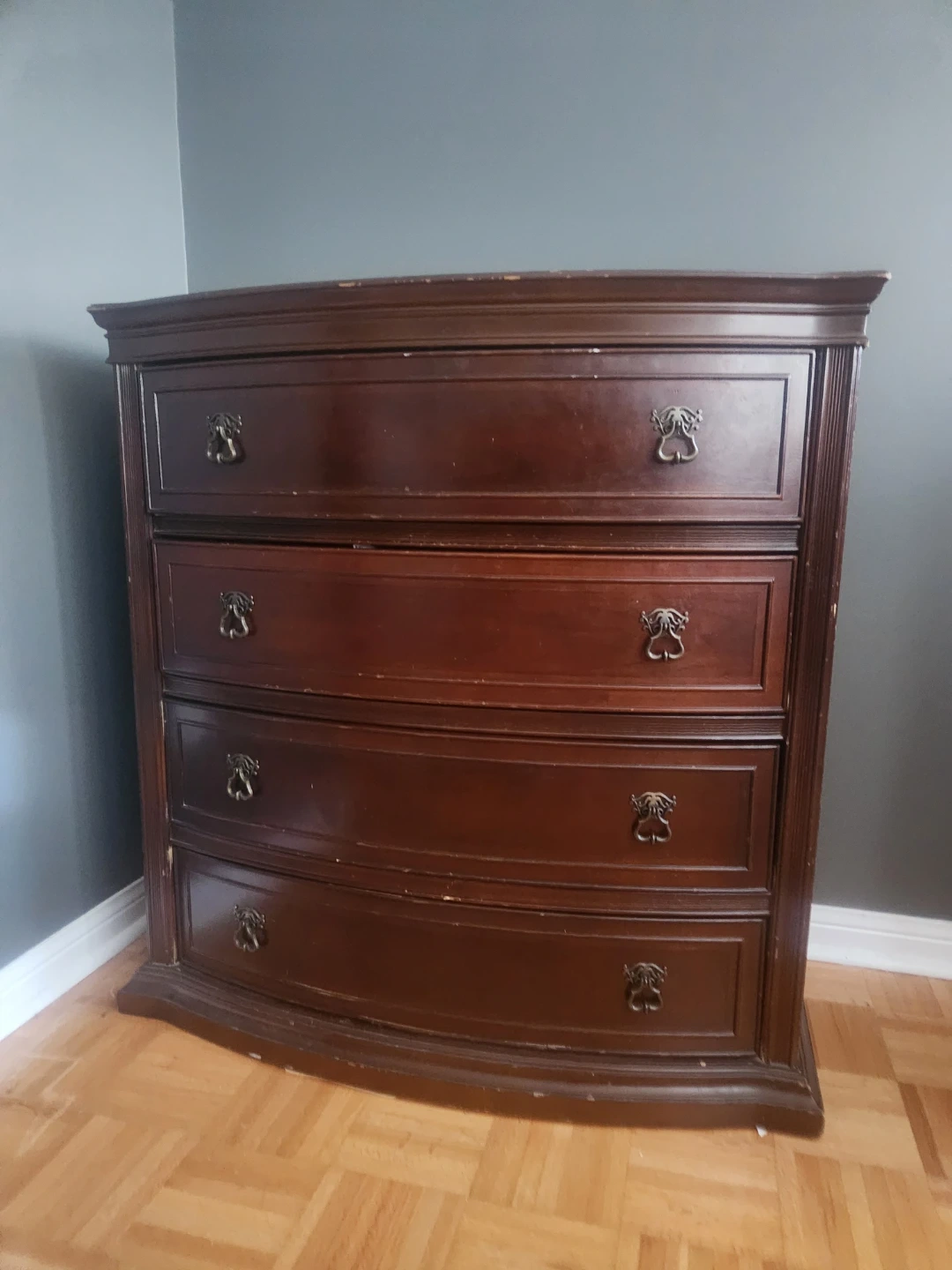 I have 2 dark brown dressers - (Bombay style) with four drawers. It's made of wood and features ornate drawer pulls.