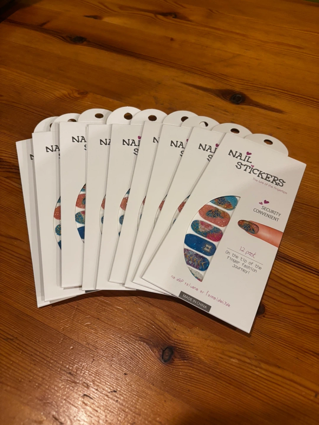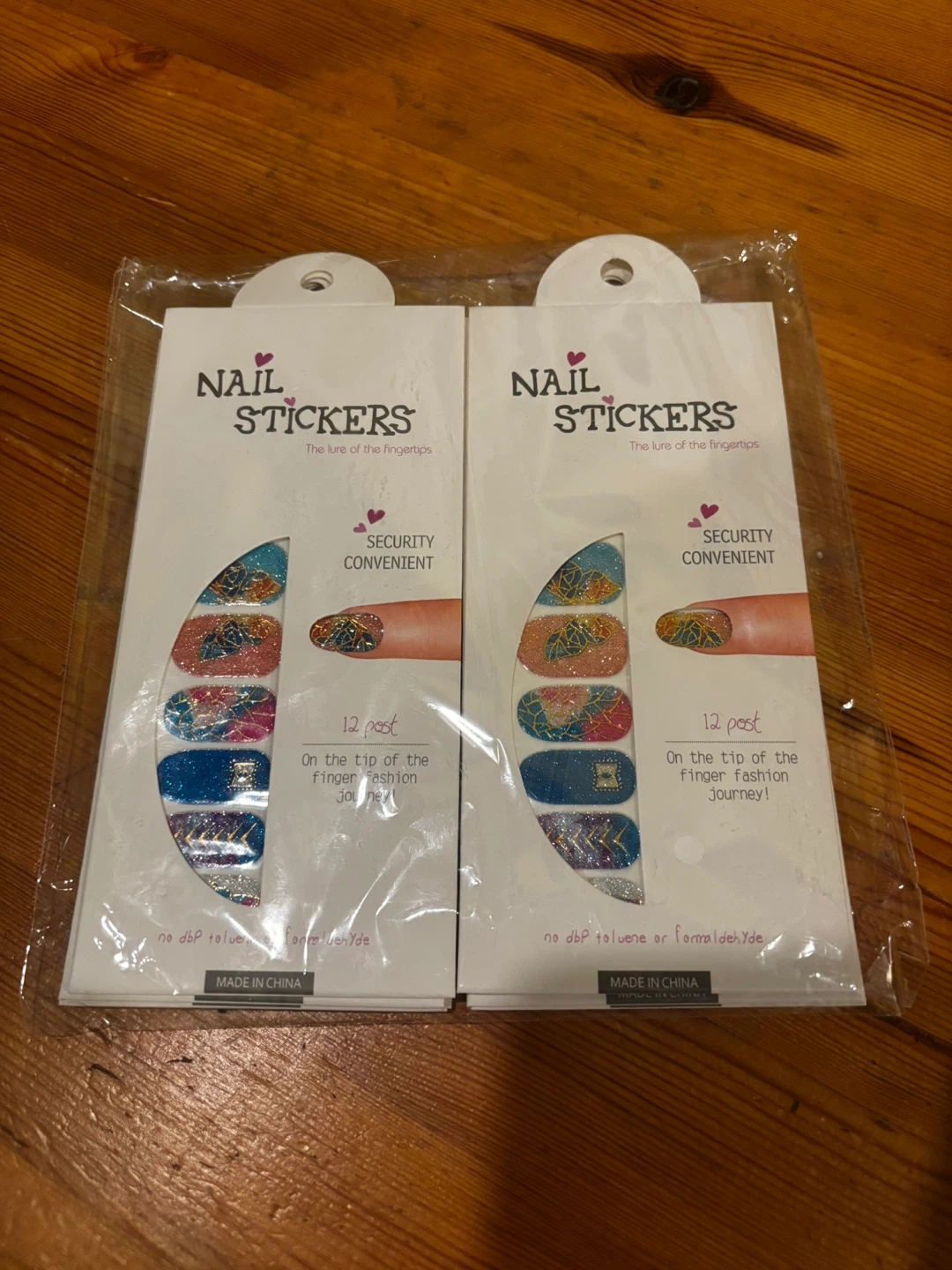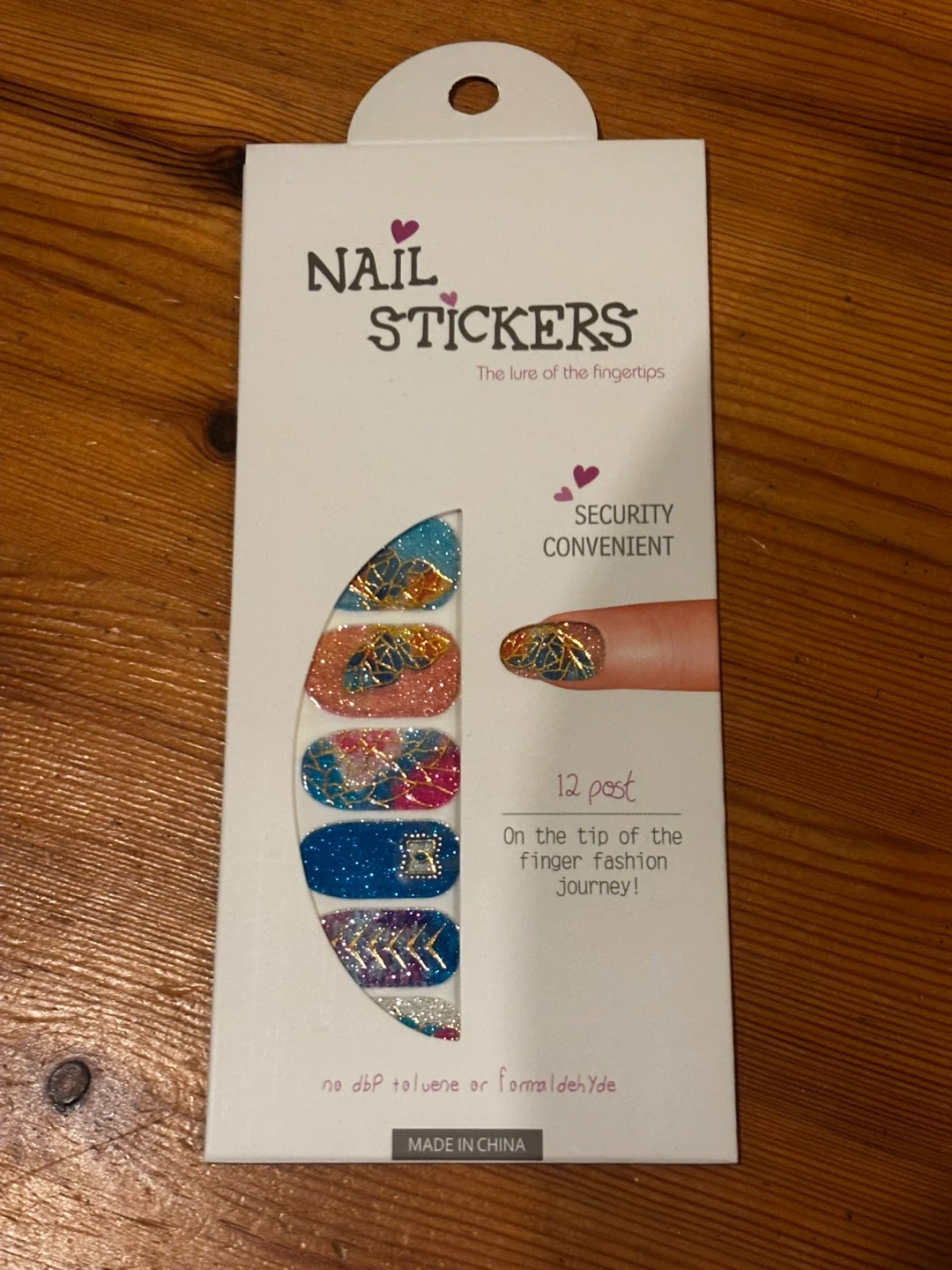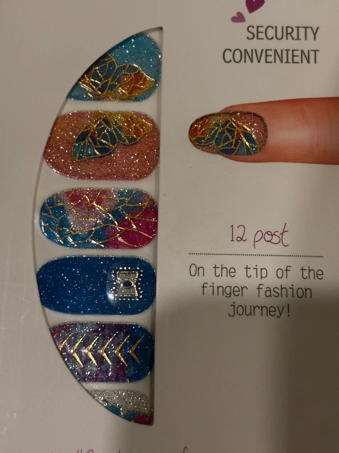 This is a set of nail stickers, with 12 post stickers included. They're designed for easy application and a fashionable look. The stickers are colorful with various patterns.