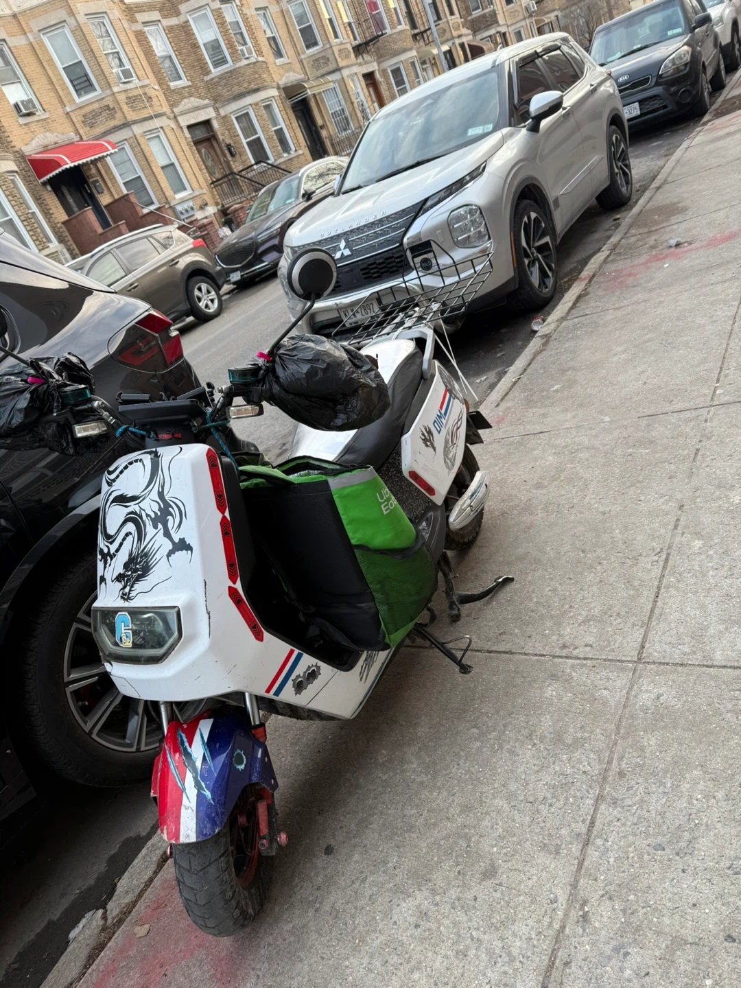 Electric Scooter with Dragon Decal and Delivery Bag