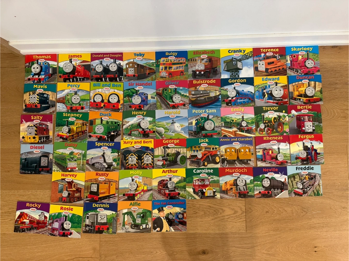 A large collection of Thomas the Tank Engine story books from My Thomas Story Library. These books feature various characters and adventures from the beloved children's show. They're great for young fans of trains and storytelling! Perfect for kids who love to read.