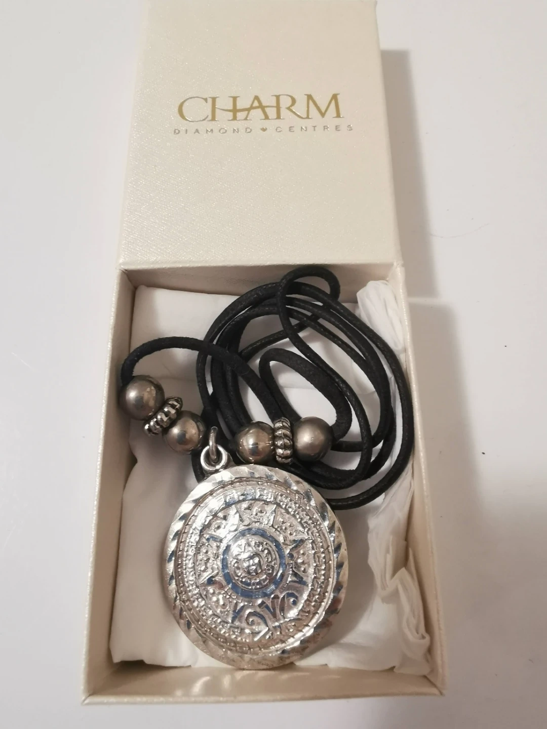 Selling a lovely 925 silver pendant necklace from Mexico π² π½ in a Charm Diamond Centres box! The pendant has a unique Aztec calendar design and is about 30mm in diameter, with a thick black strap, which you can remove and add a silver chain to, if you'd like to!