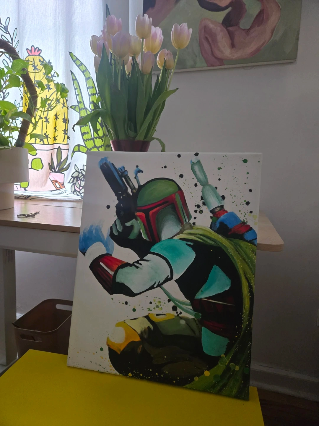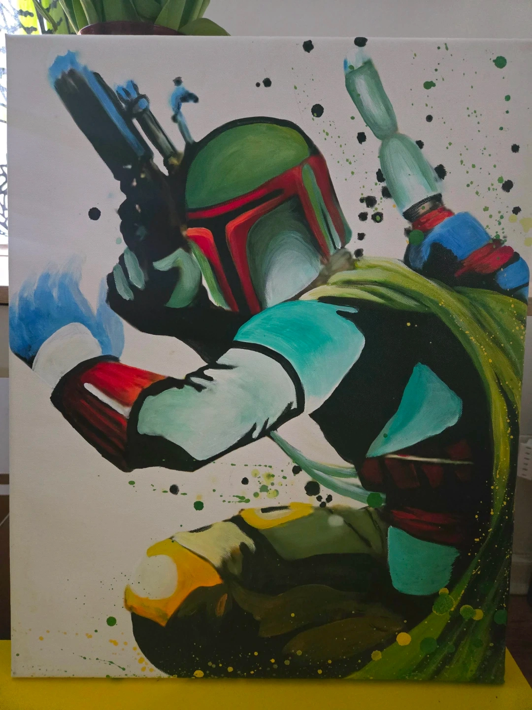 This is an original canvas painting featuring the iconic character Boba Fett from Star Wars. It's a unique piece for any Star Wars fan's collection!