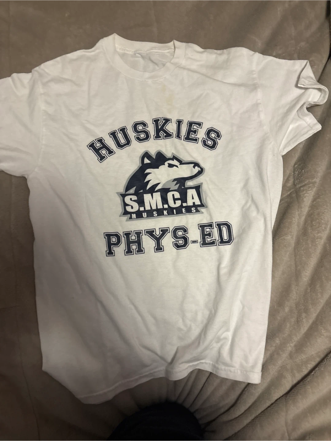 White t-shirt with 'Huskies' and 'S.M.C.A PHYS-ED' graphics. Cotton material. Perfect for school spirit wear or casual use!